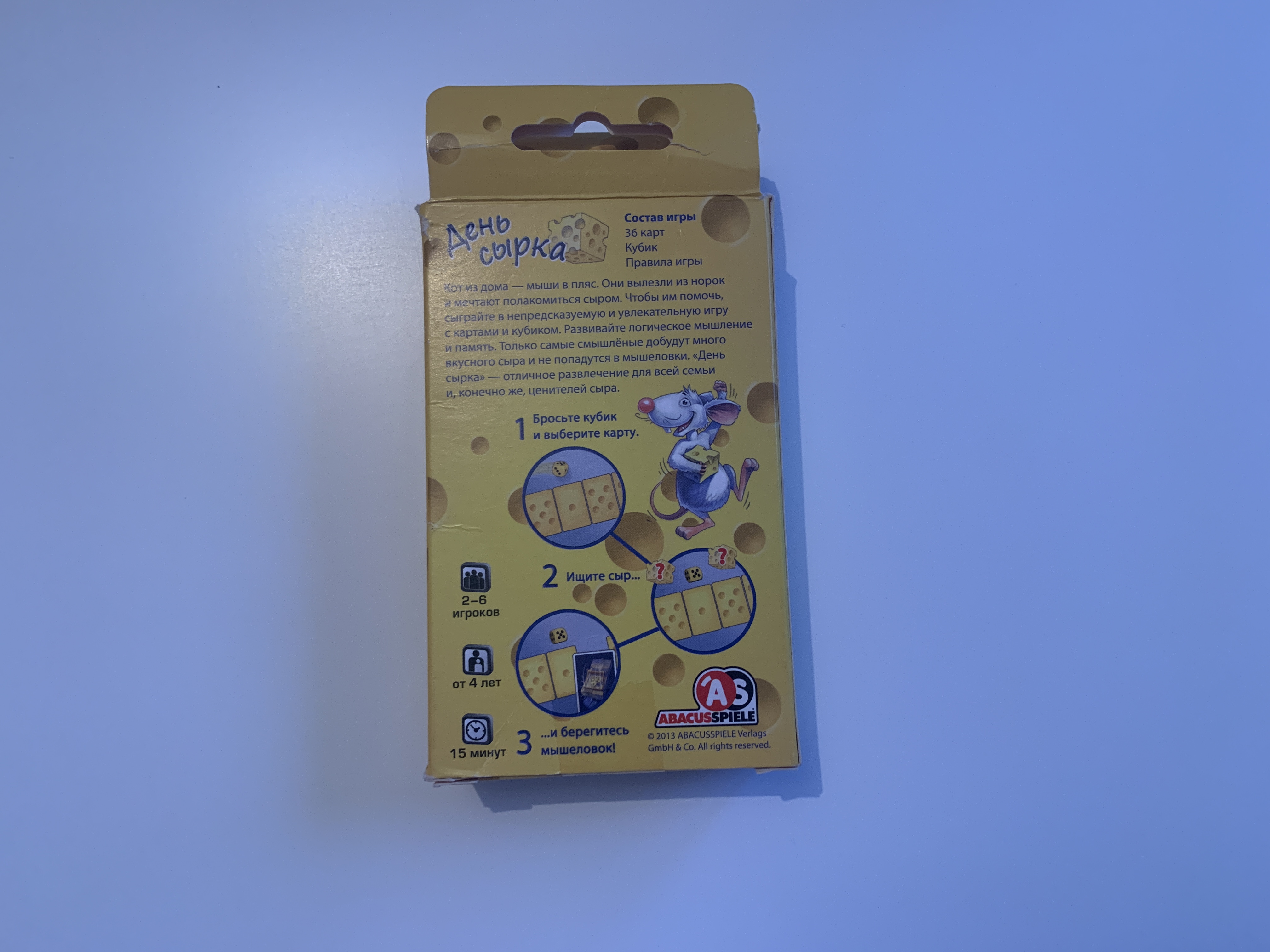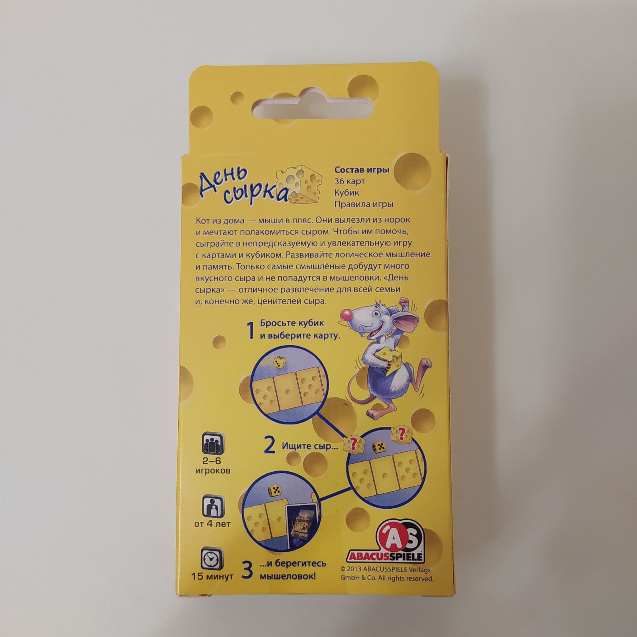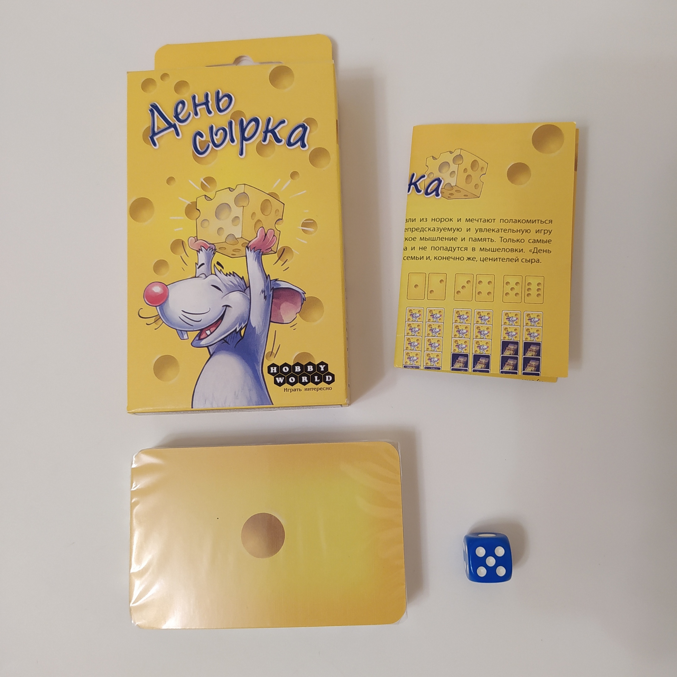 "День сырка" – это весёлая соревновательная настольная игра, предназначенная для 2-6 детей в возрасте от пяти лет и старше (5+). Игроки перевоплотятся в маленьких отважных мышат и будут добывать сыр, стараясь избежать мышеловок и собрать максимальное количество сырных дырок. Больше дырок на карточке – больше шансов наткнуться на мышеловку. Три попадания в мышеловку грозят выбыванием из игры.