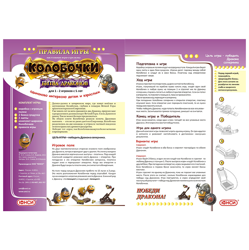 Комплектация: цветная упаковочная коробка с игровым полем, палочки-лапты (4 шт), сундучки (4 шт), комплект Колобочков в виде шариков, подробные правила. Игровое действие происходит в упаковочной коробке, она символизирует драконью пещеру.