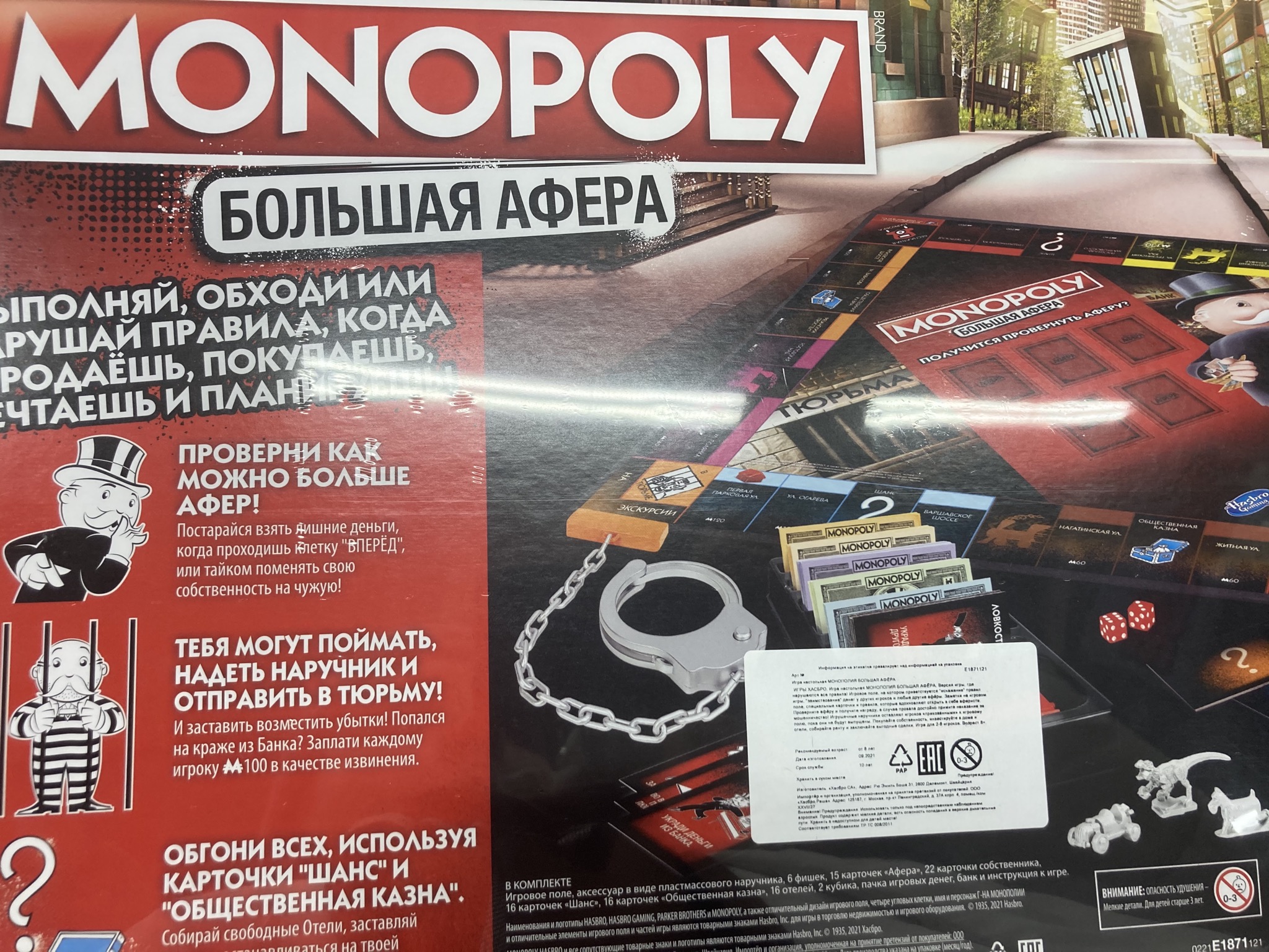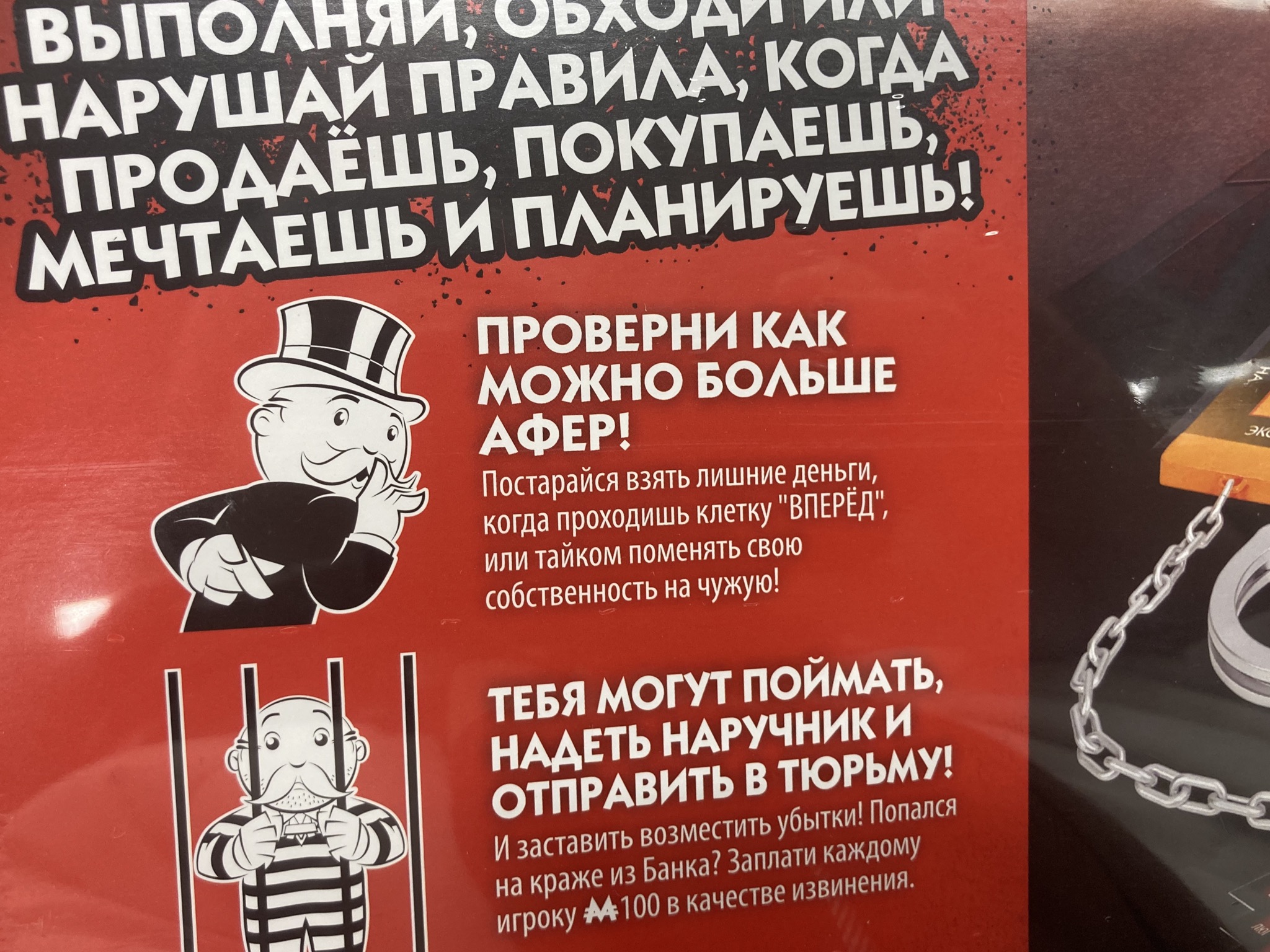 В настольной игре «Монополия. Большая афера» от Hasbro Gaming, помимо классических карточек с наименованиями зданий и строений, вы найдёте новые уникальные карточки. Например, карты «Афера» предлагают тайком нарушить правила и смухлевать в свой ход. Для этого, вероятно, придётся отвлечь игроков, использовать ловкость рук или пойти на обман, но, если всё получится, афериста ждёт заслуженная награда. Если же другие игроки были начеку и раскрыли мошенничество, то обманщик заплатит штраф и отправится в тюрьму, а это значит, что придётся в буквальном смысле примерить на себя наручники, входящие в комплект игры. Конечно, всегда можно попробовать оправдаться и избежать наказания, но это весьма непросто.