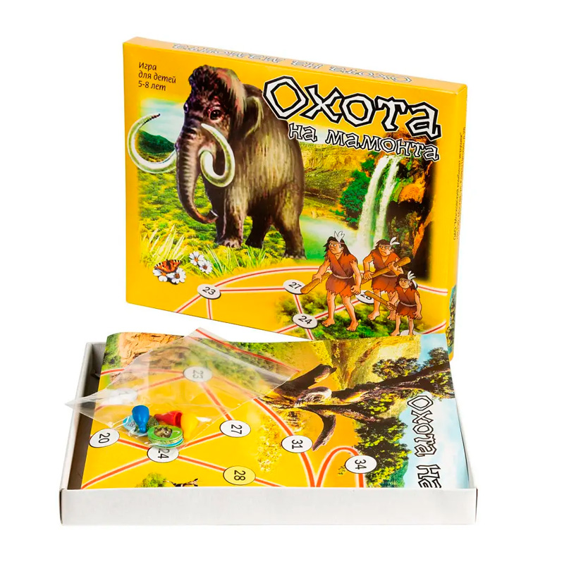 "Охота на мамонта" – это настольная игра для 2-3 игроков в возрасте от пяти лет и старше (5+). В игровой комплект входит: объёмная инструкция с подробными правилами игры, разноцветные фишки игроков разного цвета (3 шт), игровые фишки, игровое поле. Все составляющие упакованы в коробочку из плотного картона. Вес игры 200 грамм.