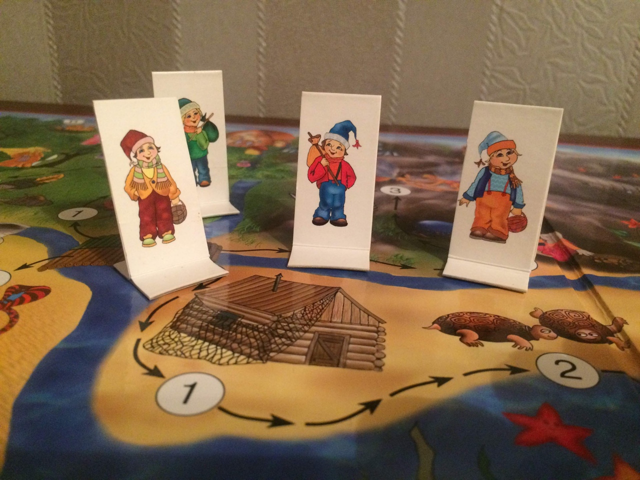 бумажные фишки в виде разноцветных гномиков.