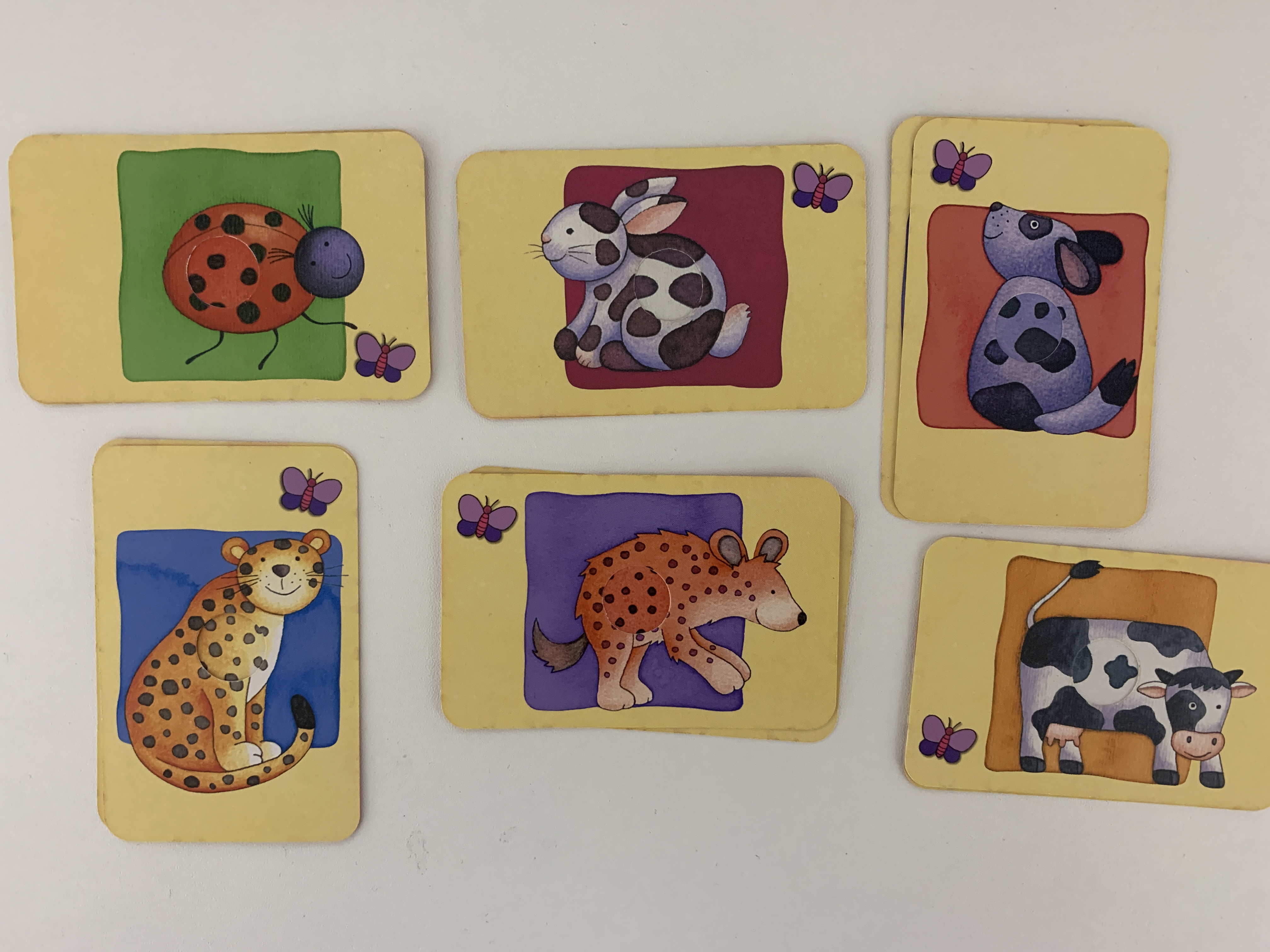 Каждый участник игры получает шесть разных карточек животных, а остальные убираются в коробку. Затем необходимо тщательно перемешать карточки узоров и выложить их стопкой в центре игрового поля лицевой стороной вниз. Самый старший из игроков вытаскивает карточку узоров и выкладывает её на игровое поле таким образом, чтобы всем играющим было хорошо её видно. Задача каждого из игроков отыскать среди своих карточек животных подходящую (с таким же узором) и накрыть ею карточку узора. Далее нужно убедиться в том, что он не ошибся. Для этого нужно повернуть карту узора и карту животного так, чтобы бабочки, изображенные на них, легли друг на друга и летели в одном направлении. Если рисунок в отверстии продолжает узор животного, участник игры угадал его. В этом случае он забирает себе карту узора, а карточку животного возвращает к остальным своим карточкам животных.