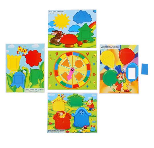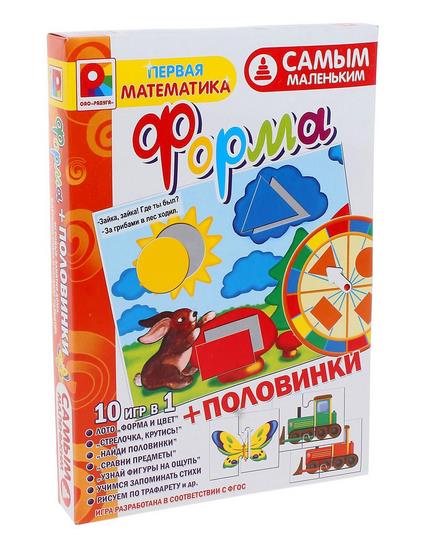 Настольная развивающая игра самым маленьким «Форма + половинки» представляет собой увлекательное и полезное развлечение, которое включает в себя десять вариантов игр и заданий. Например: лото «Форма и цвет» (помогает научиться определять геометрическую форму и определять цвет предметов); «Стрелочка крутись» (игра по простейшим правилам с помощью больших карточек, вырубных деталей и игрового поля с пластмассовой стрелкой); «Танграм для малышей» (направлен на развитие комбинаторных способностей и умений ребёнка); «Найди половинки» и «Сравни предметы» (дети учатся составлять целое из частей и сравнивать изображения); «Рисуем по трафарету» (развивается мелкая моторика пальцев и рук); «Узнай фигуры на ощупь»; «Учимся запоминать стихи» и другие.