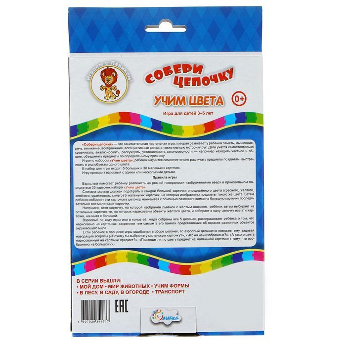 «Собери цепочку: Учим цвета» – это настольная игра от издательства Улыбка, которая входит в серию развивающих и обучающих игр «Играем с Лёвиком». Предназначена она для детей от трёх до пяти лет (3+). Игра будет одинаково интересна, как мальчикам, так и девочкам. Игровой набор поможет осознать всю прелесть такого занимательного занятия, как настольная игра. Собирая тематические цепочки, ребёнок будет непроизвольно многогранно развиваться.