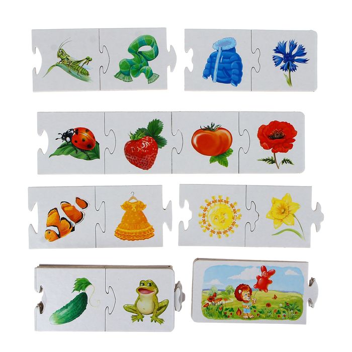 Цель игры – обучить ребят различным цветам. Ребёнок самостоятельно или с помощью взрослого раскладывает пять больших прямоугольных карточек с изображением Лёвика с воздушным шариком, а потом он должен к ним подобрать и присоединить маленькие карточки, на которых изображены картинки таких же цветов, как и шарик. Например, на основной картинке нарисован Лёвик, который гуляет в поле с шариком оранжевого цвета в виде сердечка. Ребята должны присоединить к ней пазлы с изображением рыбы-клоуна, морковки, лисы, цветка, платья, апельсина.