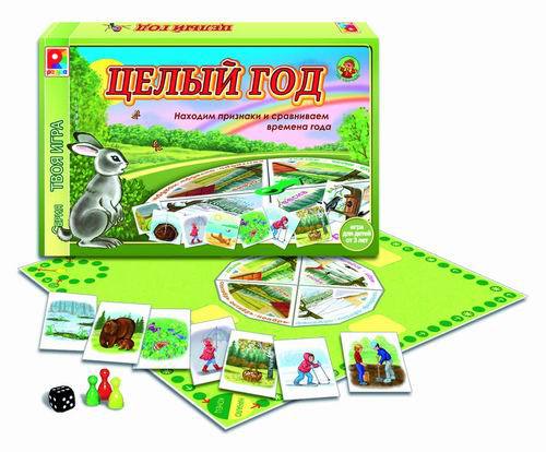 Развивающая настольная игра «Целый год» представляет собой уникальное дидактическое пособие, рекомендованное для детей от трёх лет и старше. В комплект входит: игровое поле, карточки (35 шт.), пластмассовая стрелка, кнопка, блокиратор, фишки синего, зелёного, красного и жёлтого цвета, игровой кубик, инструкция с правилами игры. В процессе игры участники по очереди вращают стрелку на игровом поле, выбирая необходимые карточки и передвигая фишки по полю. Перемещаясь, они узнают о сезонных изменениях в природе, сравнивают времена года. Кроме основных вариантов детям предлагается множество развивающих заданий и игр с карточками и полем.