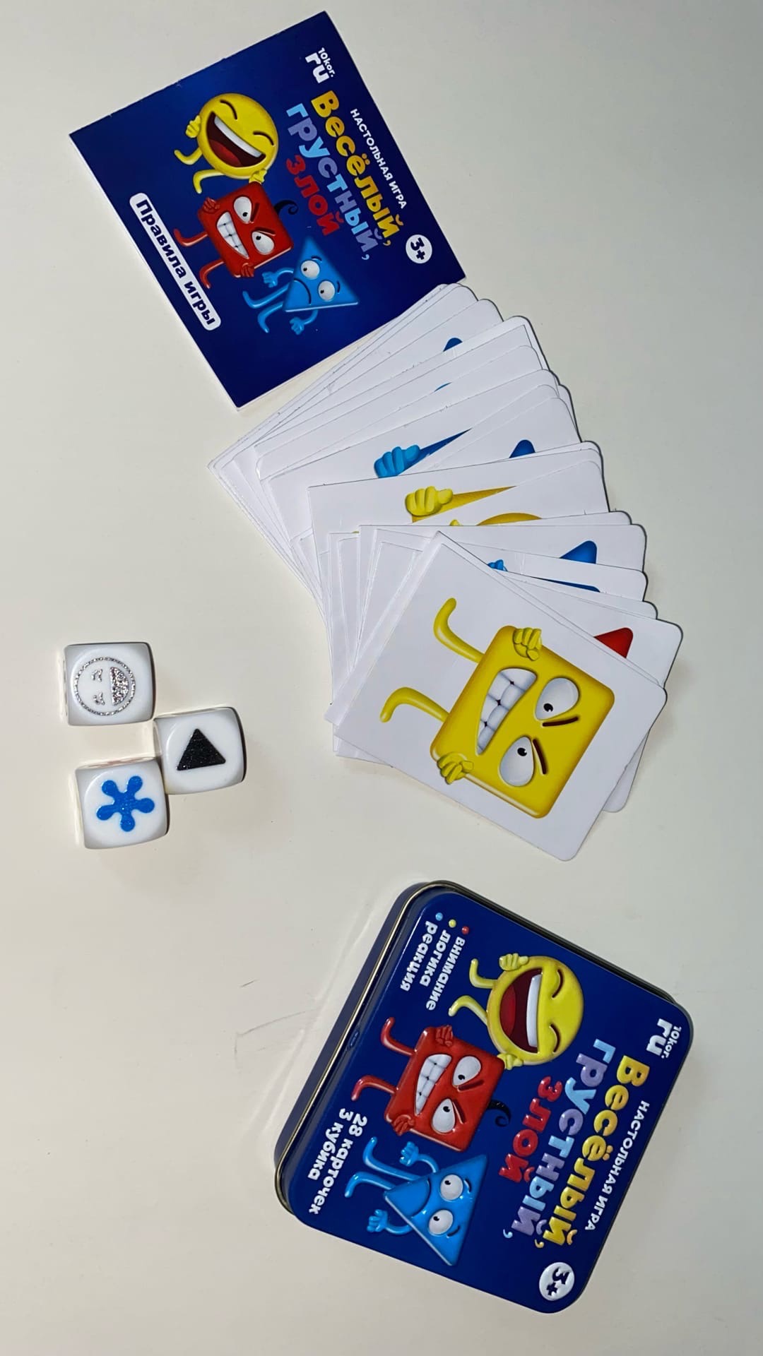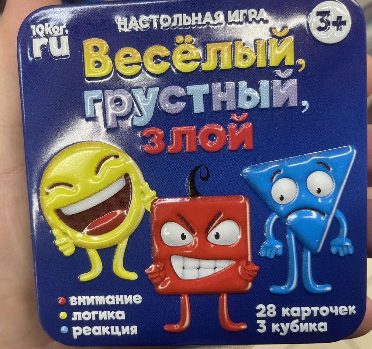 Настольная игра "Веселый, грустный, злой" в жестяной коробке от ТМ "Десятое королевство" упакована в миниатюрную жестяную квадратную коробочку, которая с легкостью помещается в кармане. Внутри коробки располагается 32 карточки, 3 кубика с изображением цвета, фигуры и эмоции, небольшая брошюра с правилами игры.