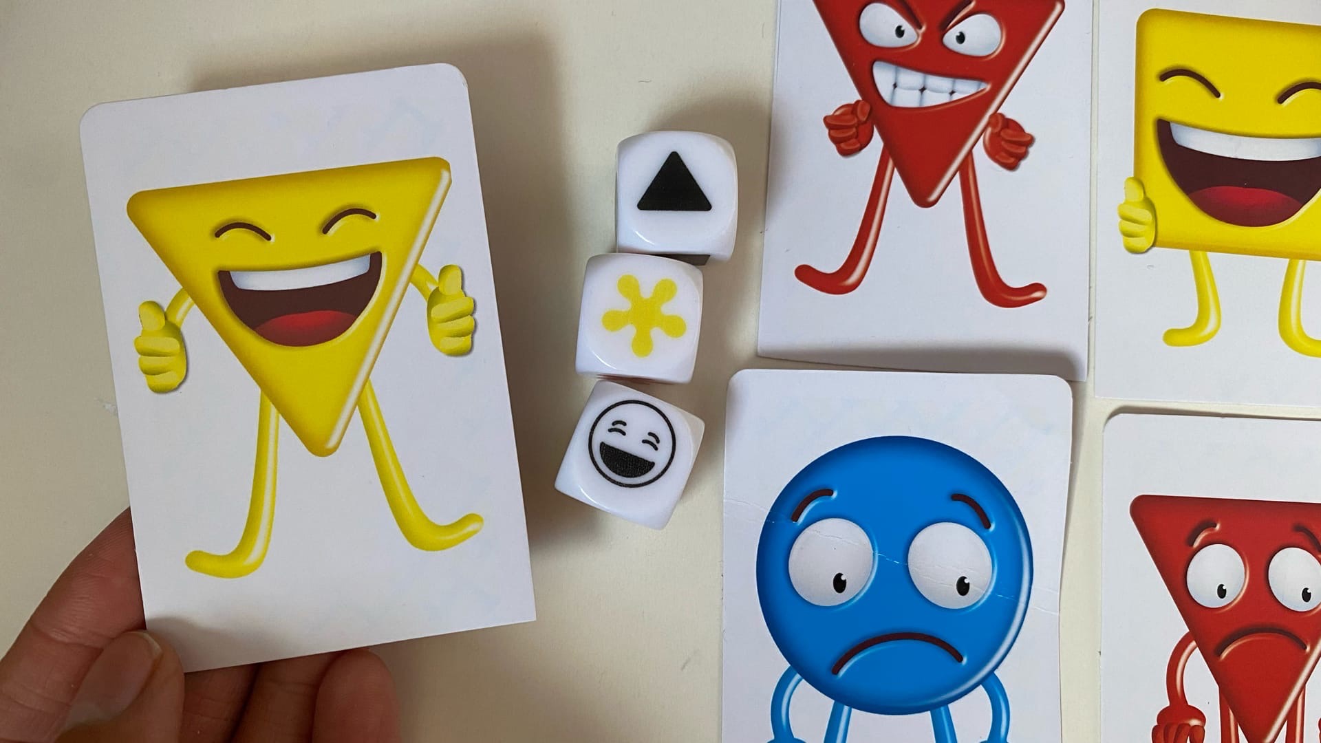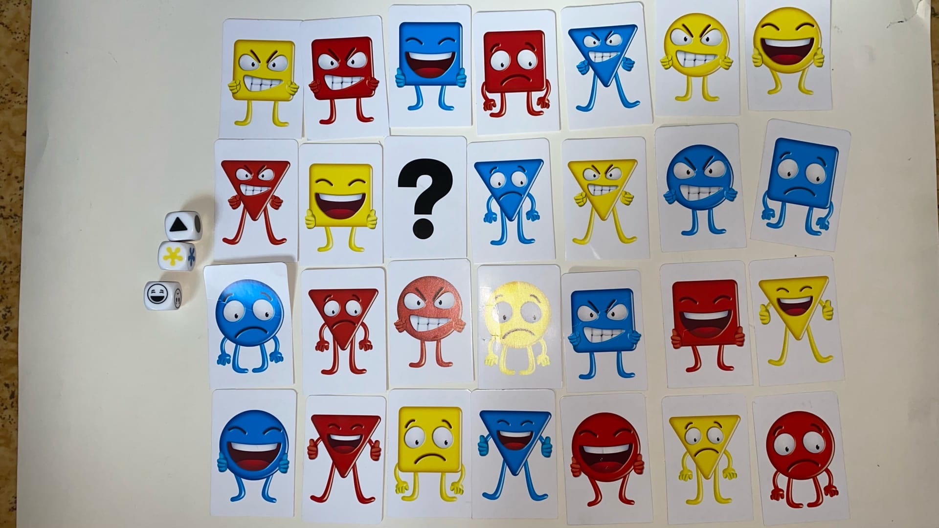 В игре участвуют от 2 до 6 игроков. Каждому игроку раздаются по 9 карт, на которых изображены лица людей в разных эмоциональных состояниях: веселый, грустный, злой. Также есть карта “нет эмоций”, которую можно использовать, если игрок не чувствует себя в определенном эмоциональном состоянии.
