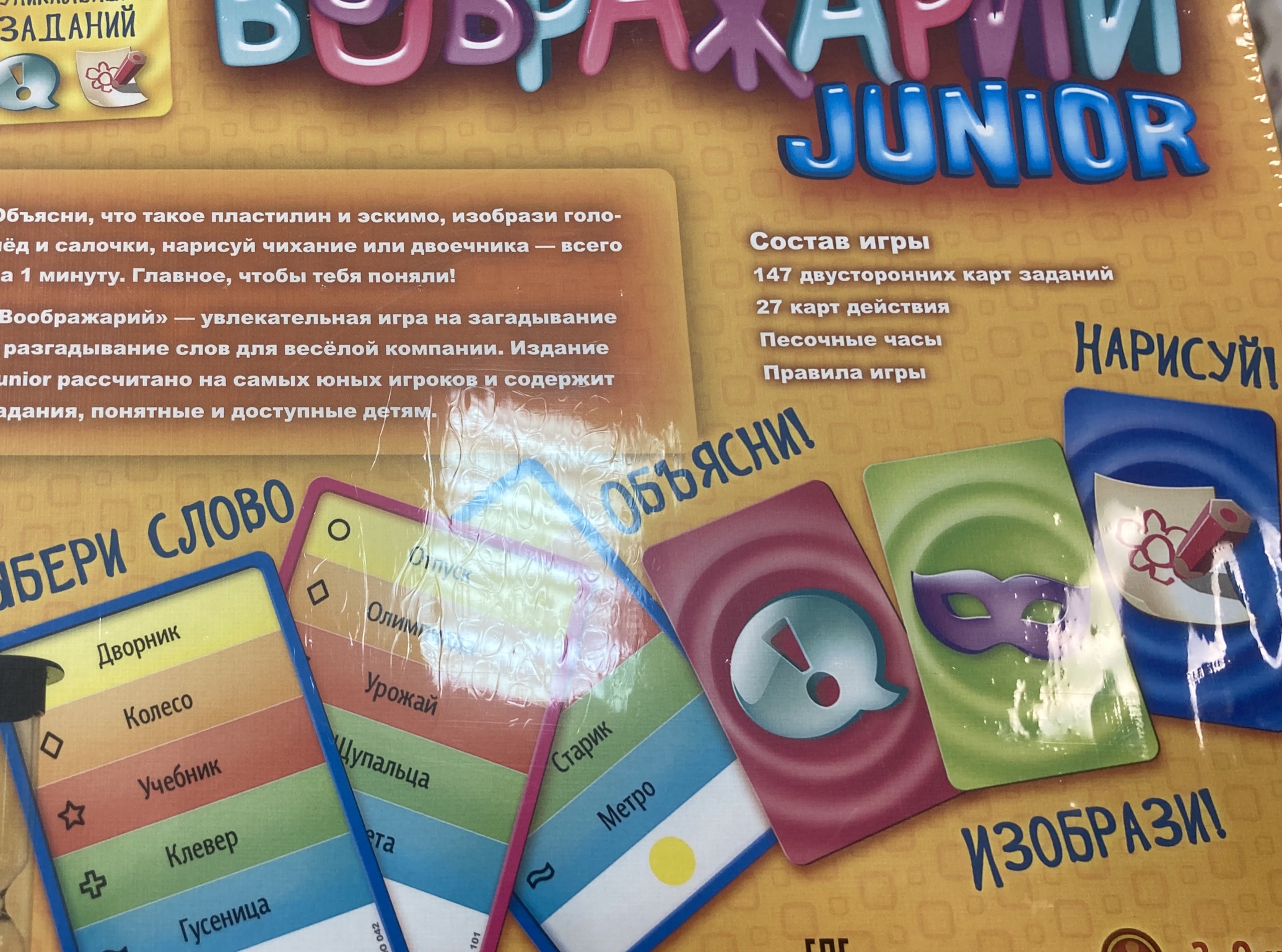 «Воображарий Junior» — увлекательная игра на загадывание и разгадывание слов для весёлой компании. Объясни, что такое пластилин и эскимо, изобрази гололёд и салочки, нарисуй чихание или двоечника — всего за 1 минуту. Главное, чтобы тебя поняли! Издание Junior рассчитано на самых юных игроков и содержит задания, понятные и доступные детям. Продолжительность игры: от 30 минут.