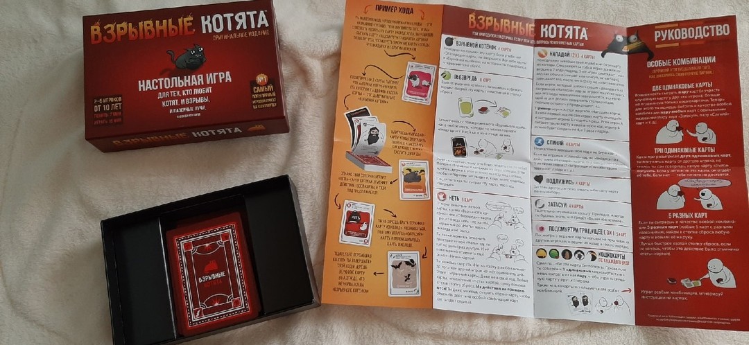 Первый раз пришлось играть вместе с ребенком, чтобы помочь ей разобраться с правилами игры. Нам показалось немного сложновато сначала. Но потом мы посмотрели видеоинструкцию и стало более менее понятно как играть. Ссылка на обучающее видео есть в инструкции. Игру эту можно отнести к стратегической, по типу игры UNO. Игроки по очереди берут карты из колоды, пока кто-то из них не вытянет взрывного котёнка.
