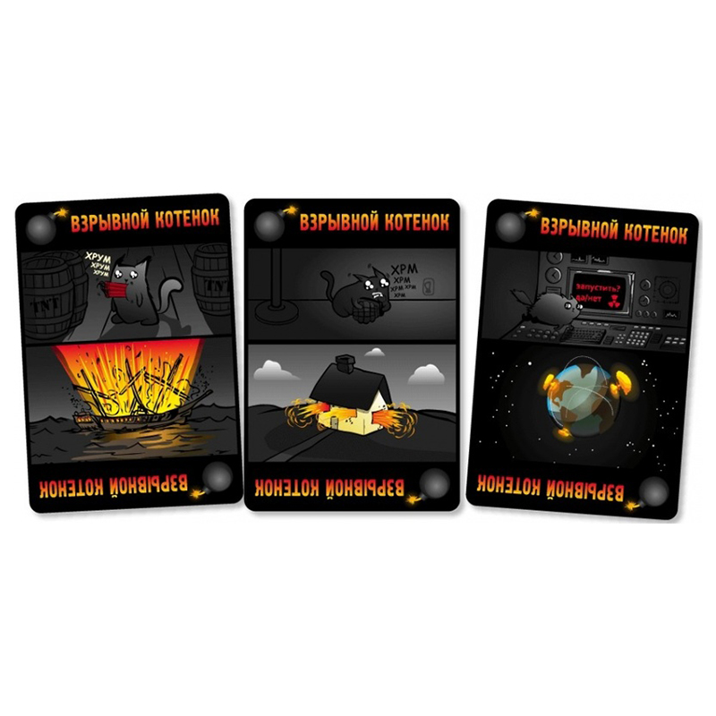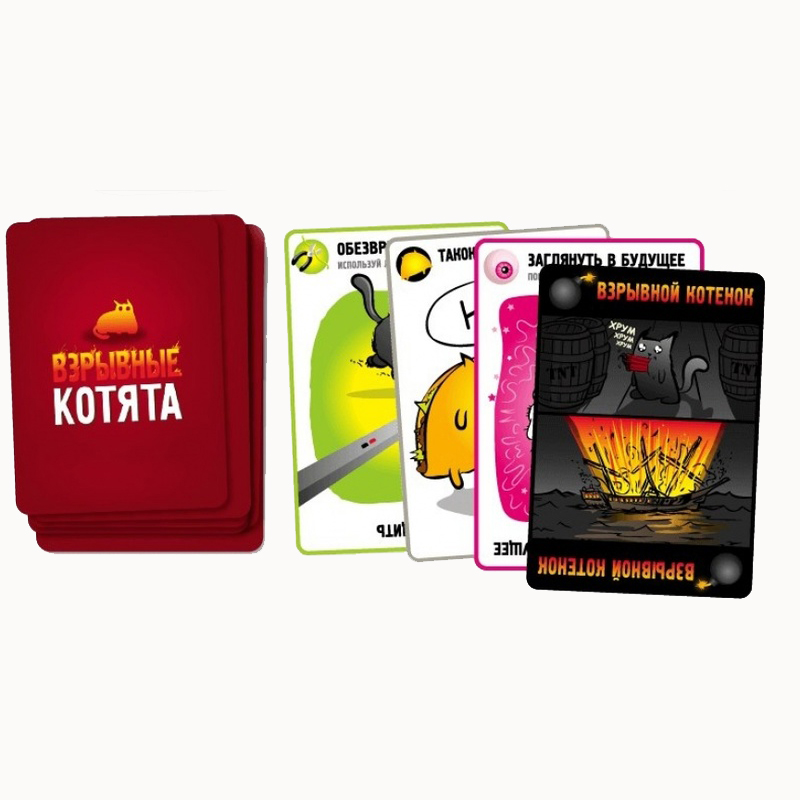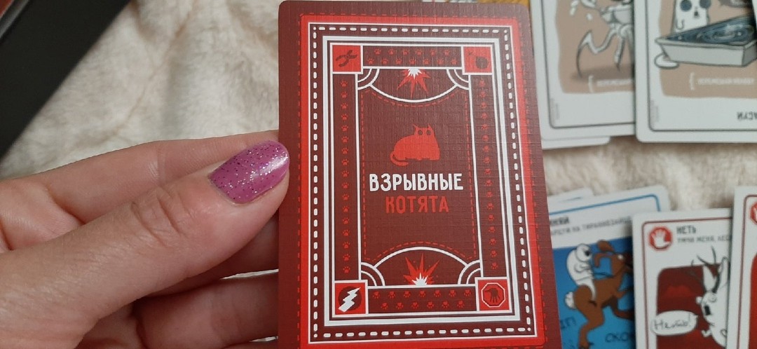 На рубашке карт написано взрывные котята. Карты сами сделаны из очень тонкого, но плотного картона. Очень мне понравилось качество исполнения игры. Приятно в такую играть.