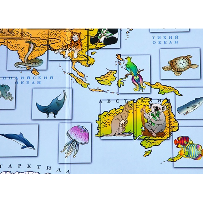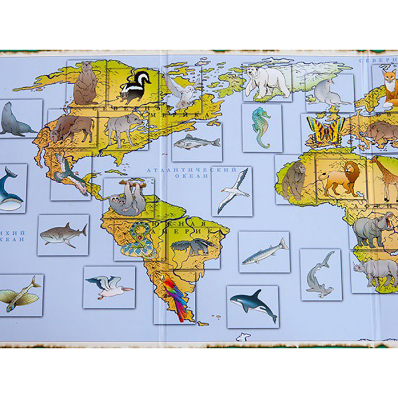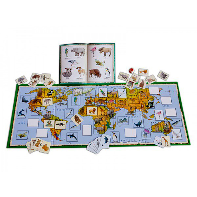 Игровое поле представляет собой географическую карту мира с изображёнными на ней животными, птицами, рыбами в местах их обитания. В игровом наборе есть справочник с описанием каждого из них: названием, средой обитания, особенностями питания и другими фактами, а также отдельные карточки с этими животными. В начале игры дети внимательно изучают справочный материал, рассматривают карточки с иллюстрациями животных, запоминают их названия. Потом карточки выкладываются на игровое поле-карту лицевой стороной вниз в отмеченные участки в случайном порядке.