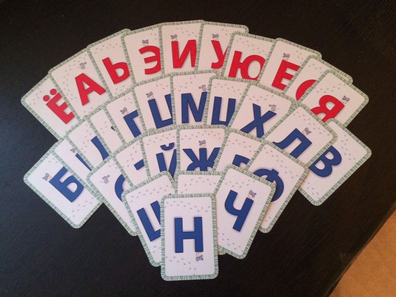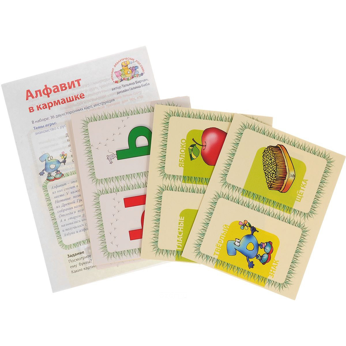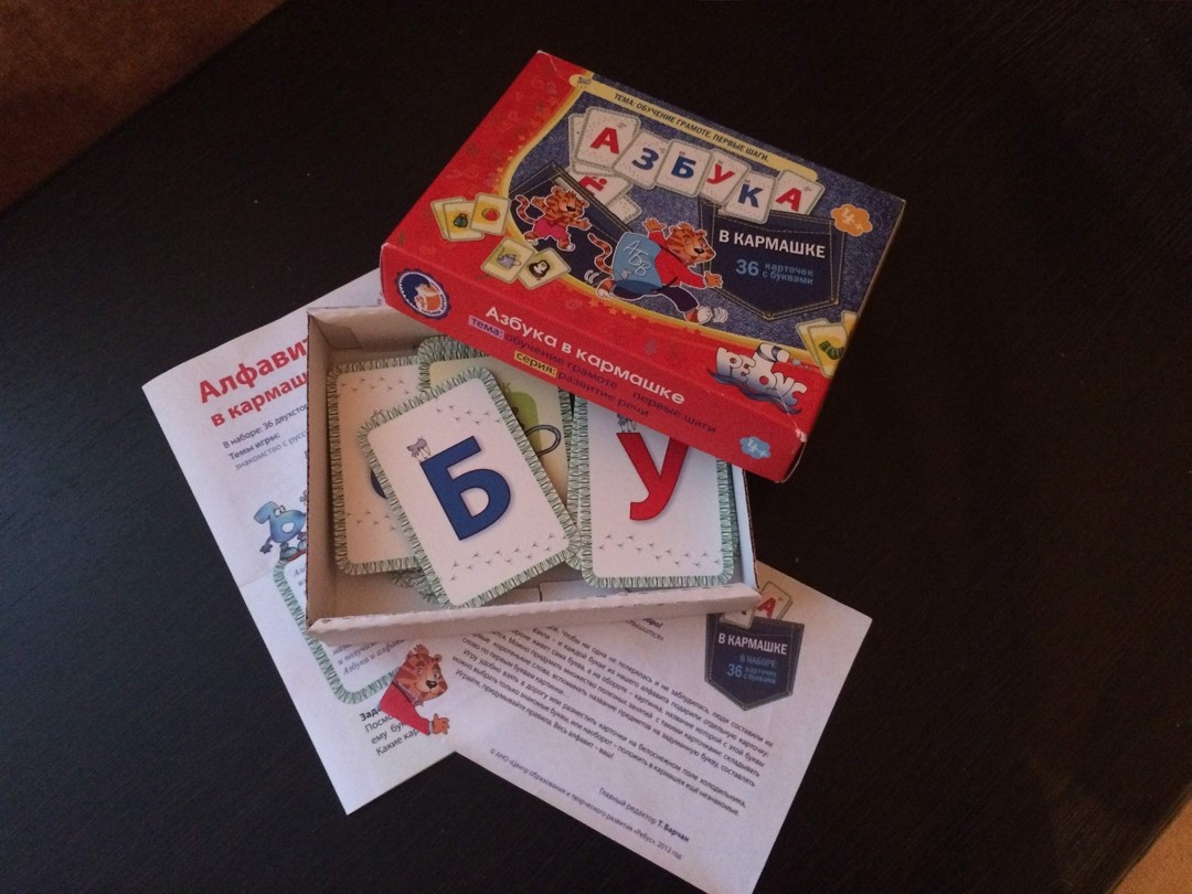 Перед нами 33 карточки – буквы русского алфавита, 1 карточка только с согласными, карточка только с гласными буквами и карточка, на которой изображены все 33 буквы вместе. Гласные буквы красного цвета, согласные – синего. Изначально буковки находятся на плотной картонной основе по 2 шт. Края каждой карточки заранее вырублены, поэтому отделить их от основы не составляет труда. Все буковки любят порядок. Чтобы ни одна из них не потерялась, люди придумали алфавит и расставили их в определённом порядке. Производитель центр раннего развития «Ребус» для каждой буквы сделал отдельную яркую карточку: на одной стороне изображена та или иная буква, а на другой стороне – предмет, название которого с этой буквы начинается.