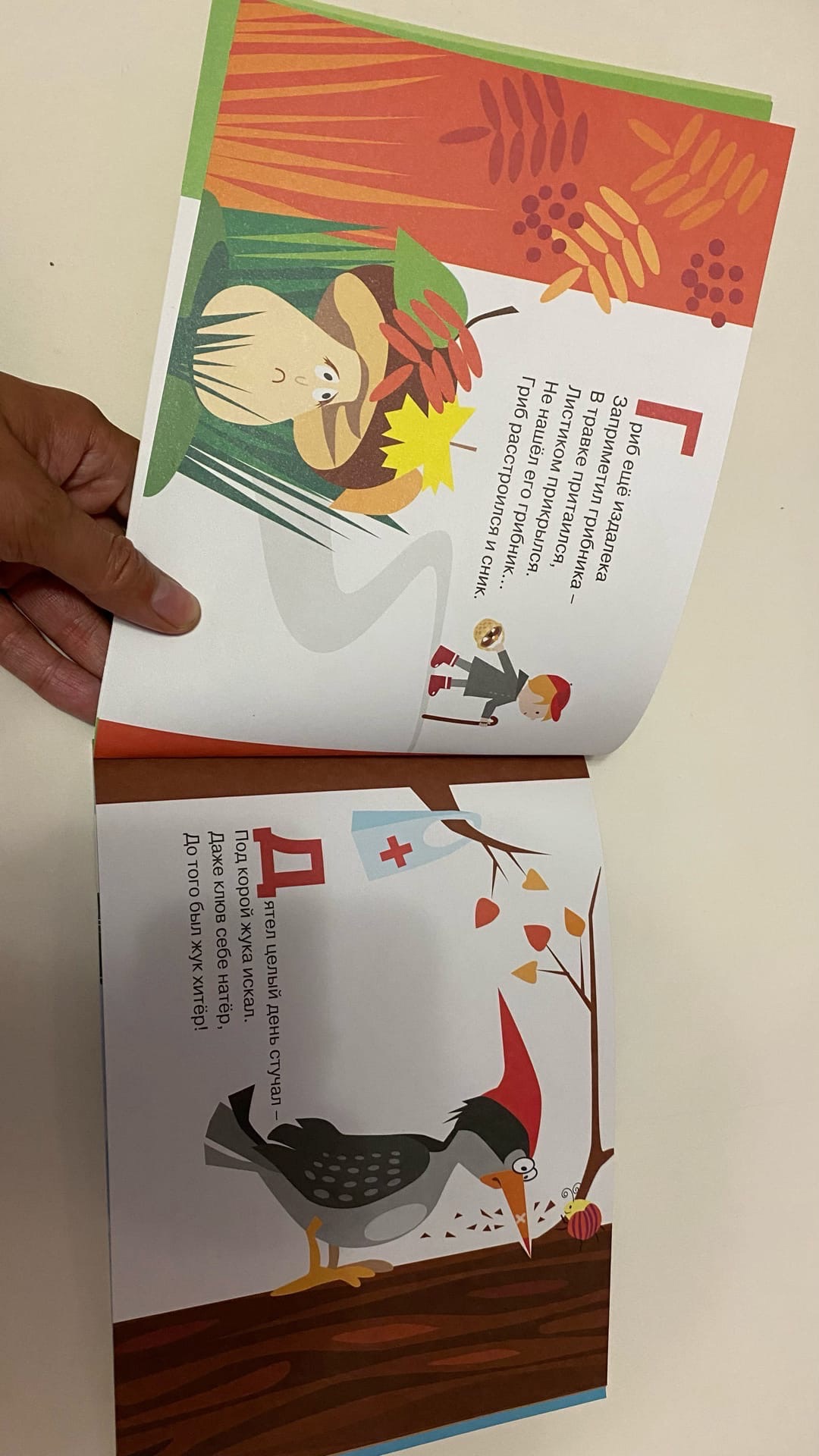 В этой азбуке первая заглавная буква алфавита выделена красным цветом. На нее стоит обращать взор ребенка, чтобы глазками запоминал. Стихотворения мне понравились, они тут короткие, понятные для детского восприятия и некоторые особенно смешные. После прочтения стихотворения обсуждаю с ребенком еще раз смысл стихотворения и соотносим его текст с картинкой.