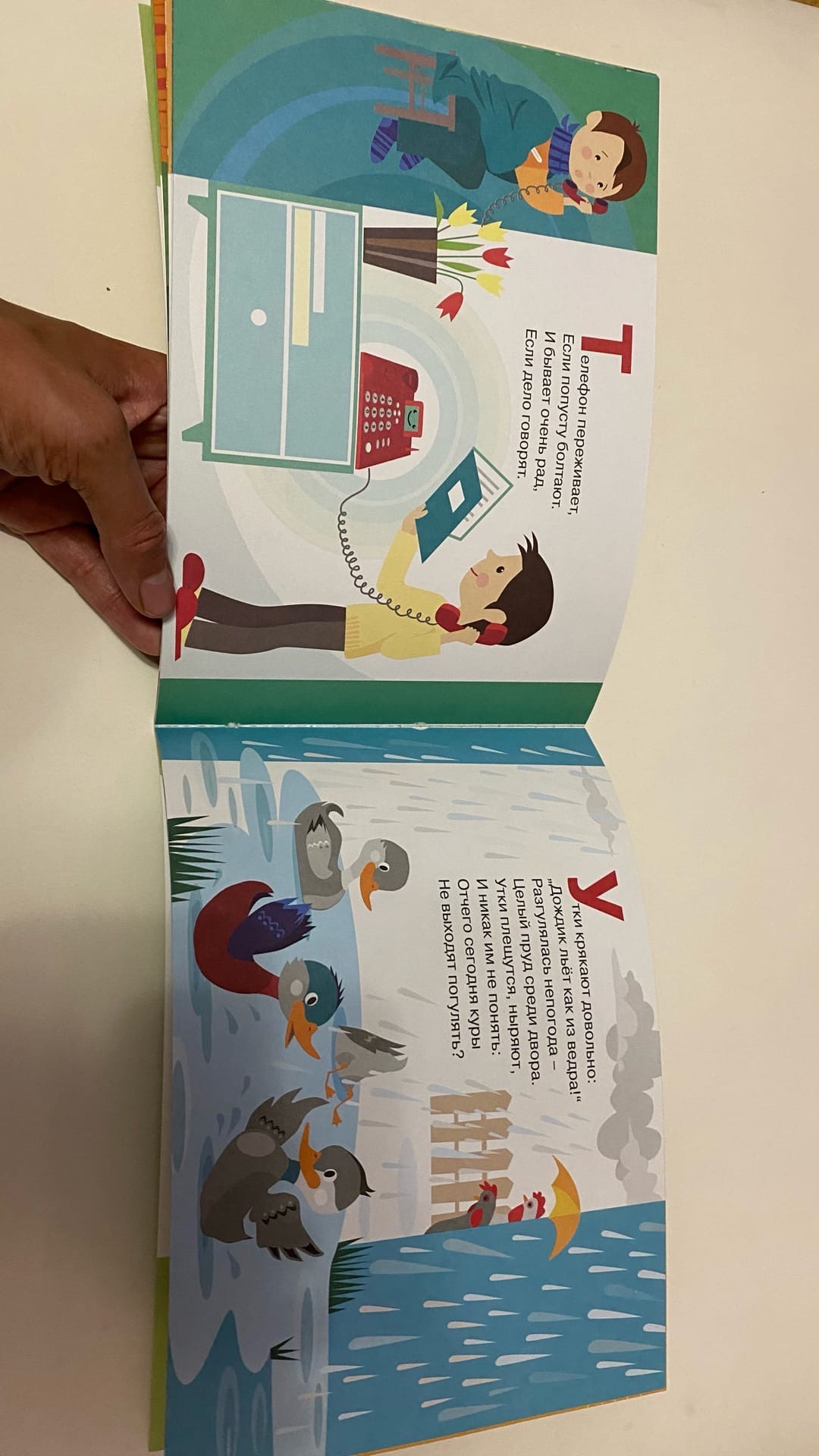 Книга нестандартного формата, вытянутая в ширину. Но для ребенка вполне удобно листать. Эта азбука красиво оформлена внутри.
