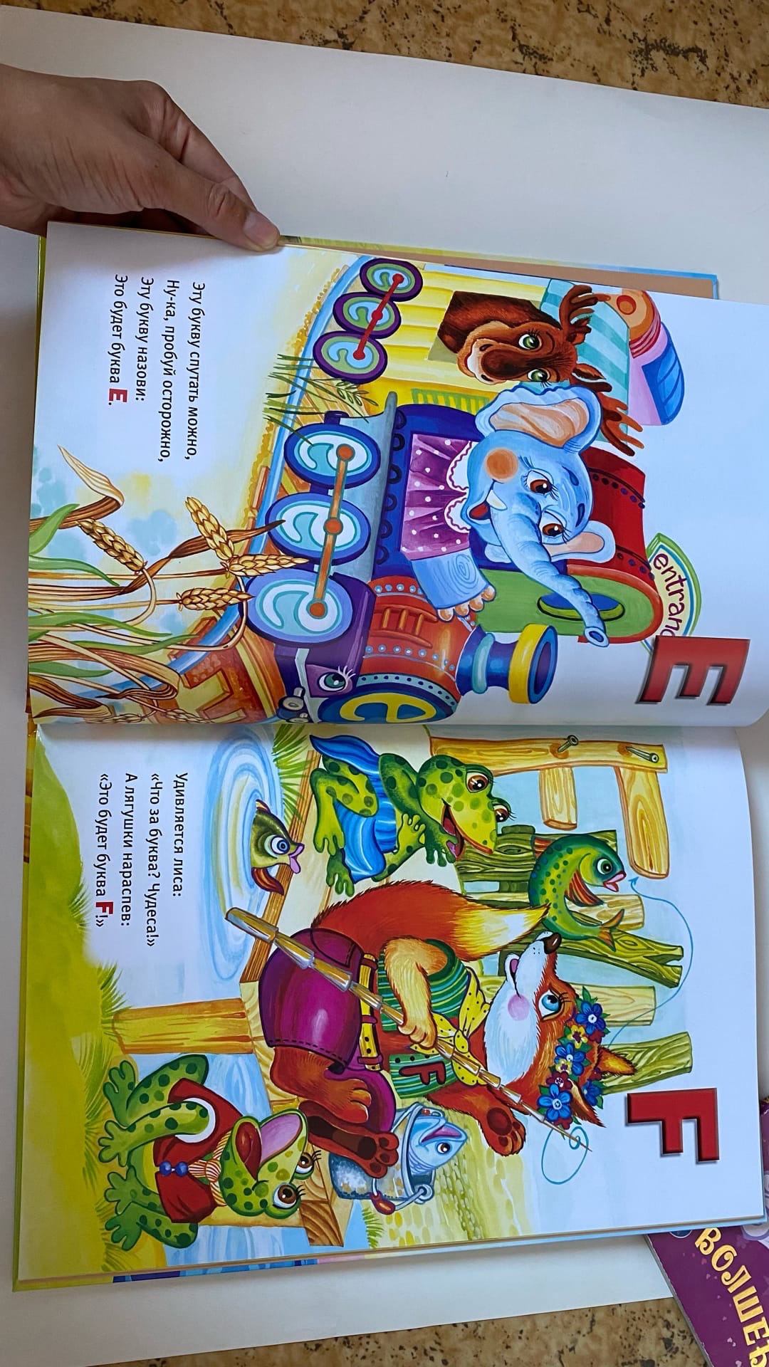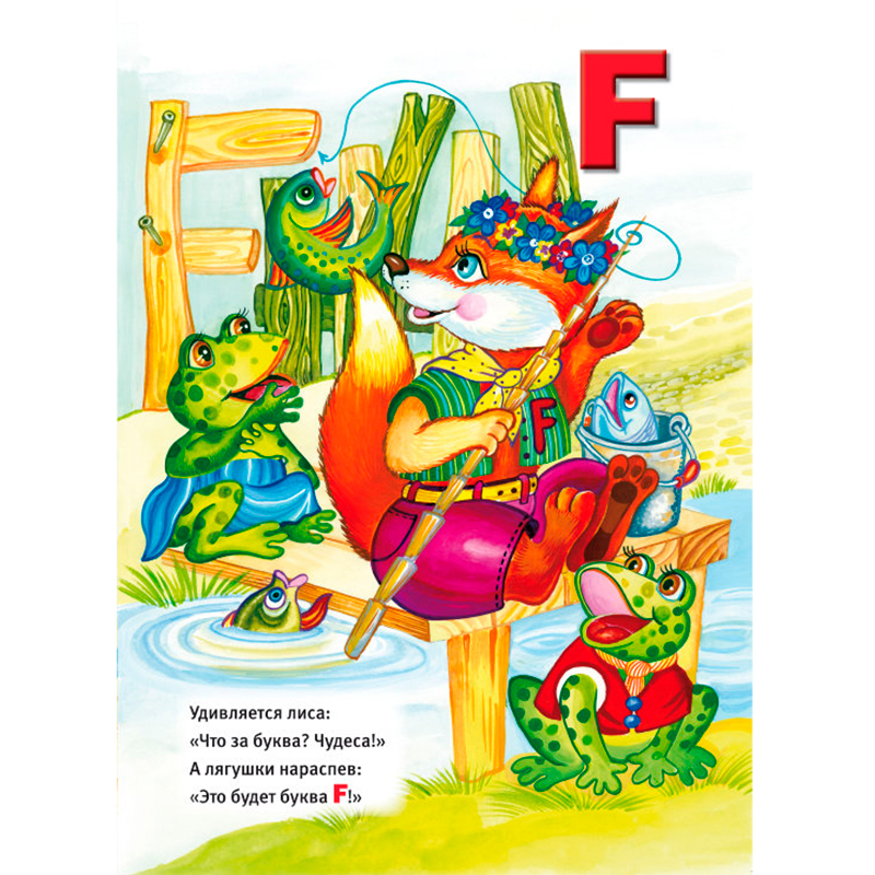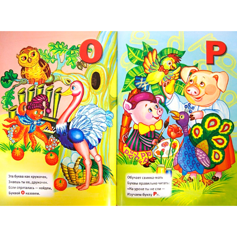 «Весёлая английская азбука» не оставит равнодушным ни одного малыша. Он обязательно обратит внимание на яркие красочные картинки и нестандартный размер издания. Краски использованы не токсичные. Книга большого формата. Размер тома 35 х 24 х 0,7 см. Вес книги 522 грамм. Каждый разворот учебного пособия отведён двум буквам. Открываем любую страницу, и видим на одном развороте осьминога, играющим на органе, страуса с корзиной наполненной яйцами, филина сидящим на суку дерева. На другой странице поросёнок с палитрой и кисточкой в руке собирается рисовать картину, свинка – мама объясняет сыночку, как нужно вести себя на уроках, а разноцветный попугай и павлин наблюдают за природой. На каждой странице напечатано четверостишье на одну из буков алфавита. Стишки лёгкие, легко запоминающиеся. Изучаемая английская буква выделена красным цветом.