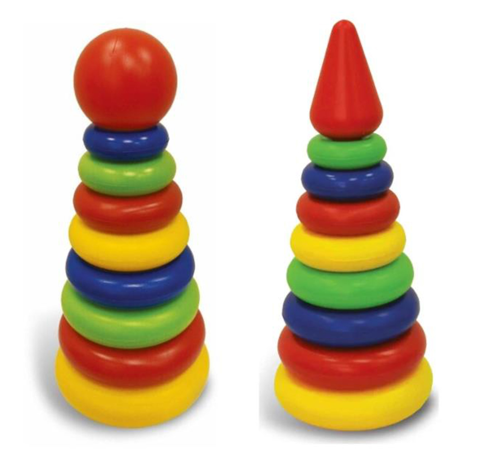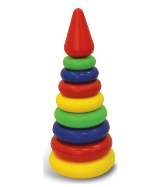 Пирамидки на 6 колец. Цель игры: научить ребенка сравнивать предметы по форме, цвету и размеру. На стержень поочередно надеваются кольца - от большого до маленького. Замыкает пирамидку маленький шарик. Игра развивает мелкую моторику, координацию движений и глазомер