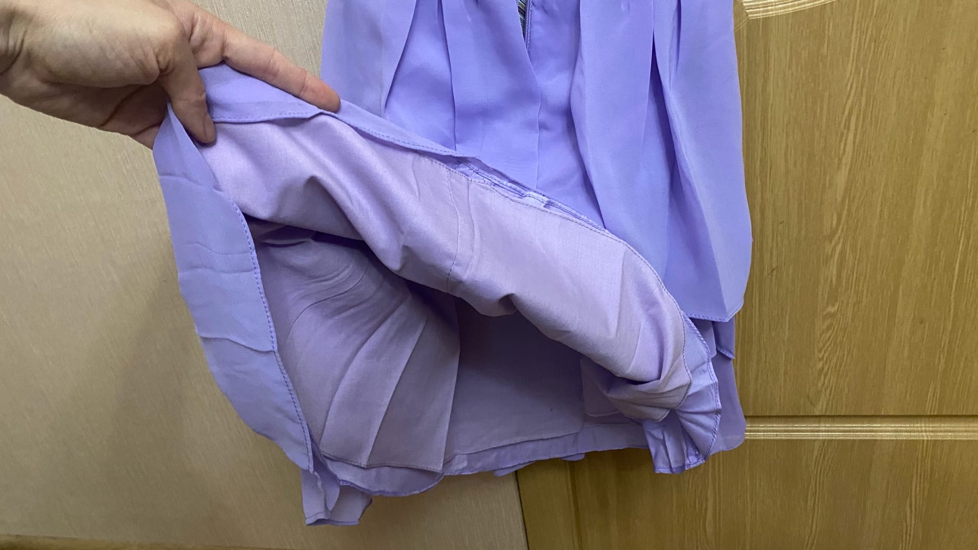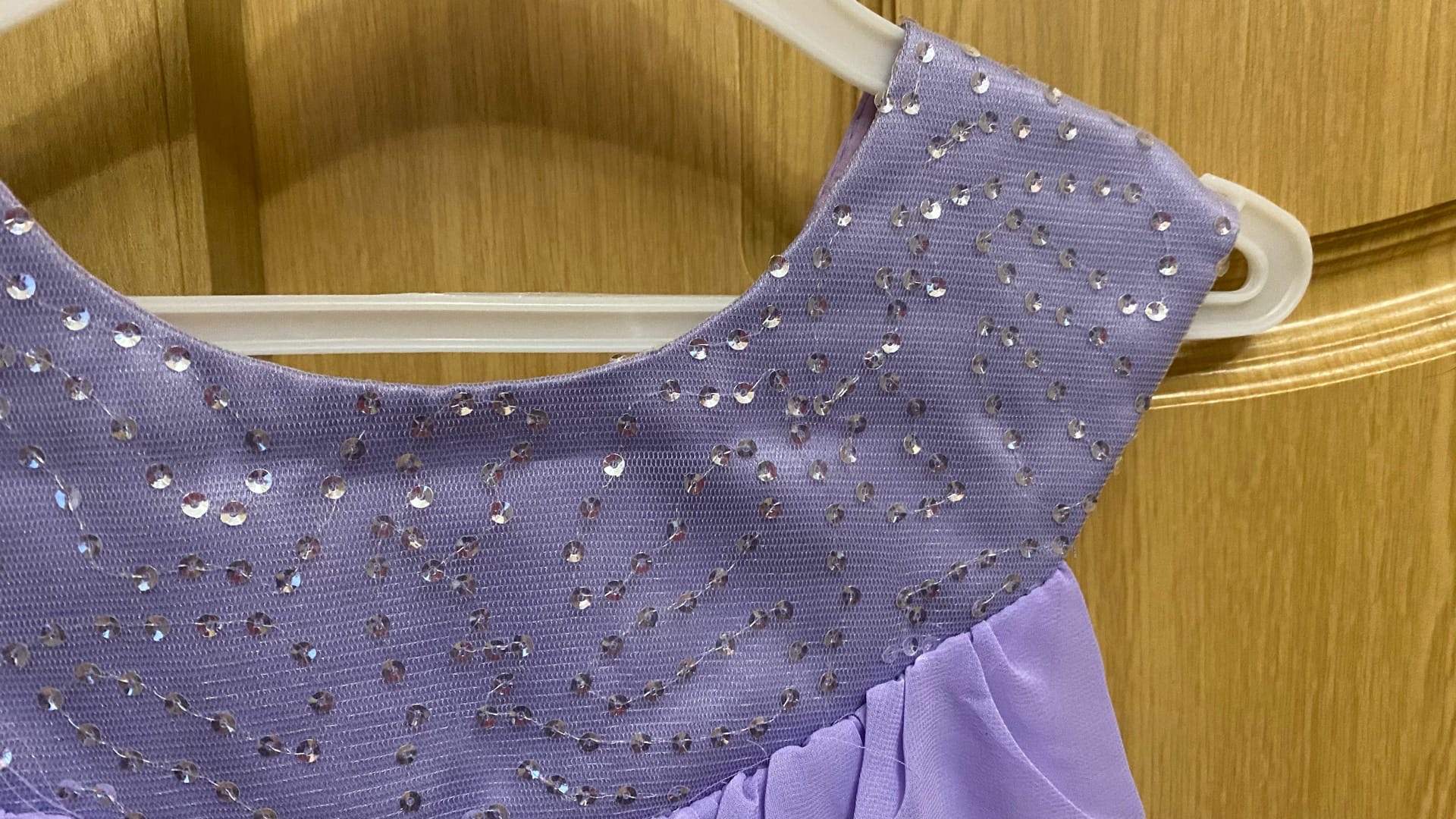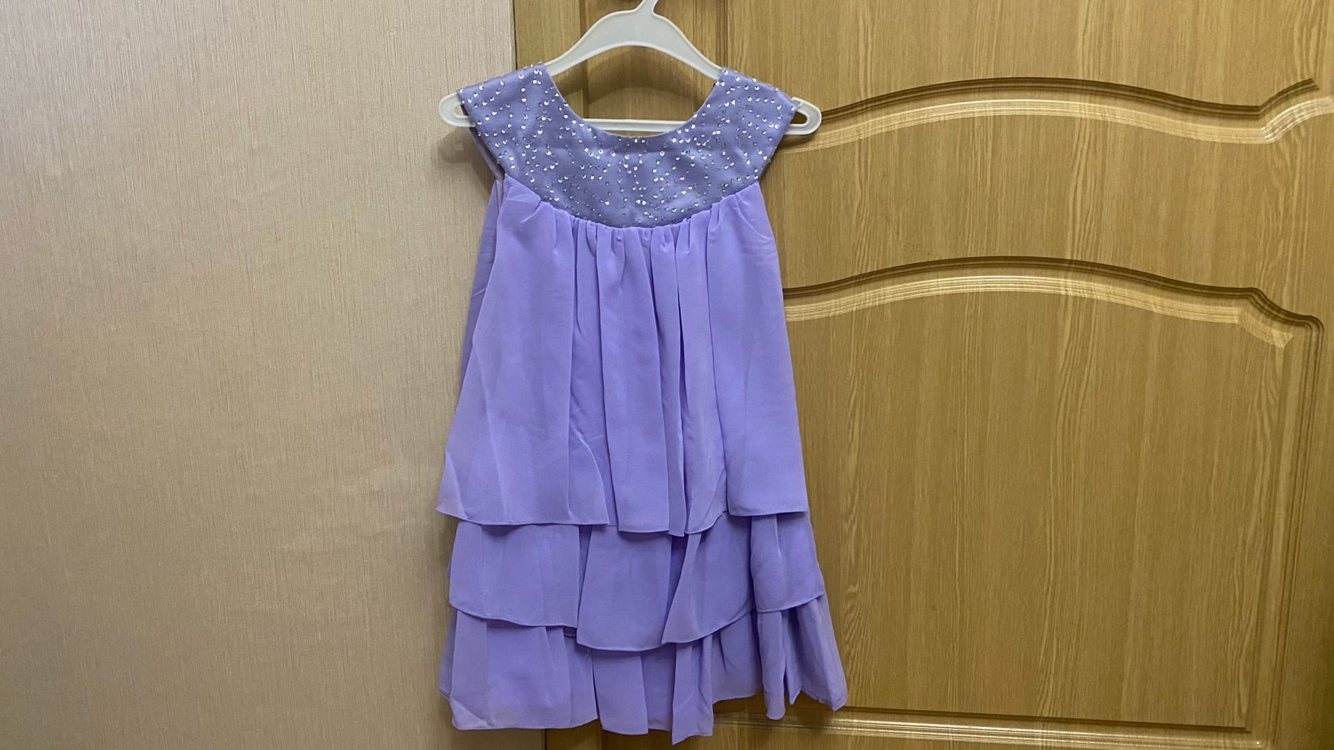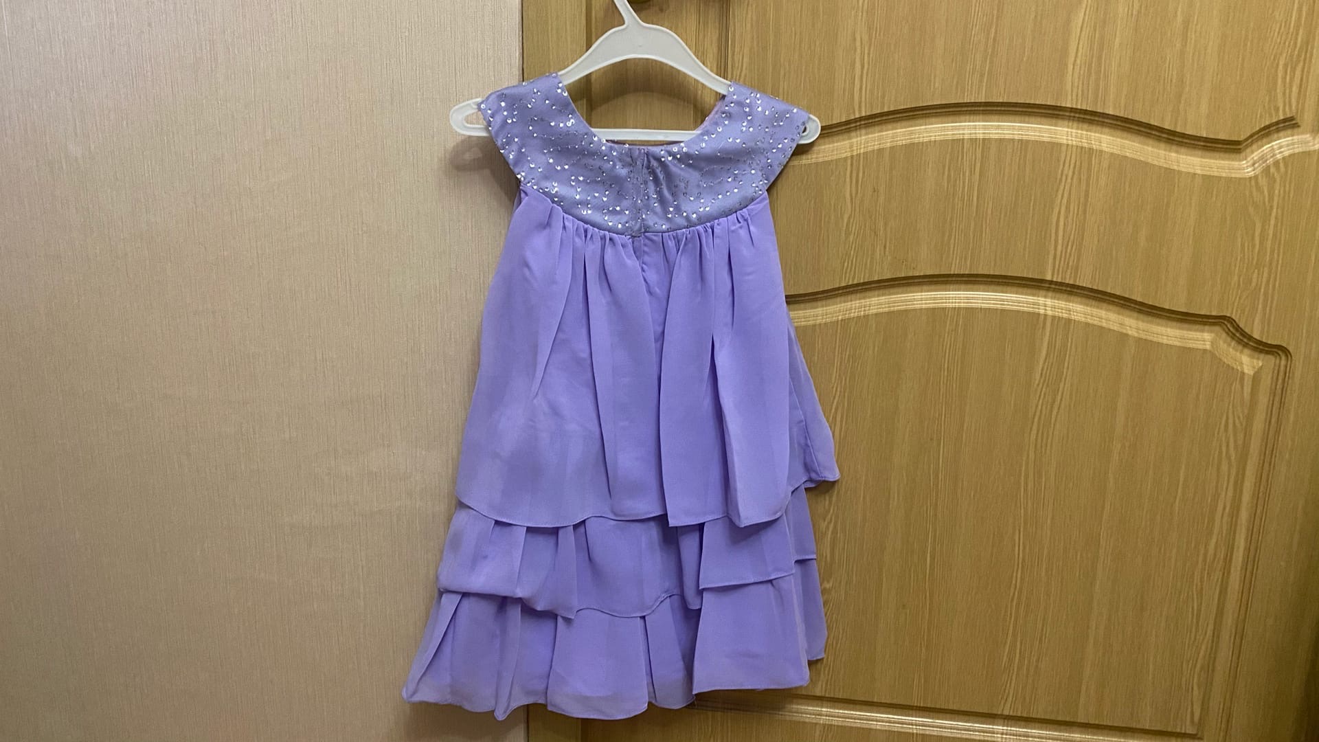 Так же планируем в нем пойти на День рождения к подружке. Это платье очень красивого и нежного сиреневого цвета. Сделано оно из шифона, это нежная струящаяся ткань в три ряда. Верх украшен тканью в виде сетки с маленькими серебряными паетками.