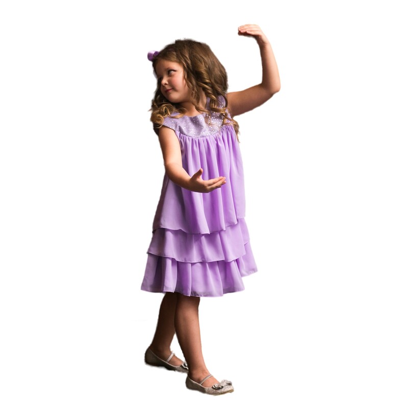 Платье Mia выполнено из приятного нежного материала сиреневого цвета. Кроме праздничных мероприятий, его можно носить как повседневное с коттоновой или кожаной курткой и высокими ботинками, также хорошо будет гармонировать кепи.