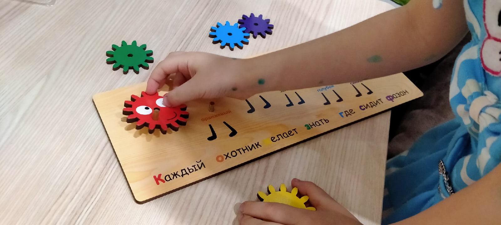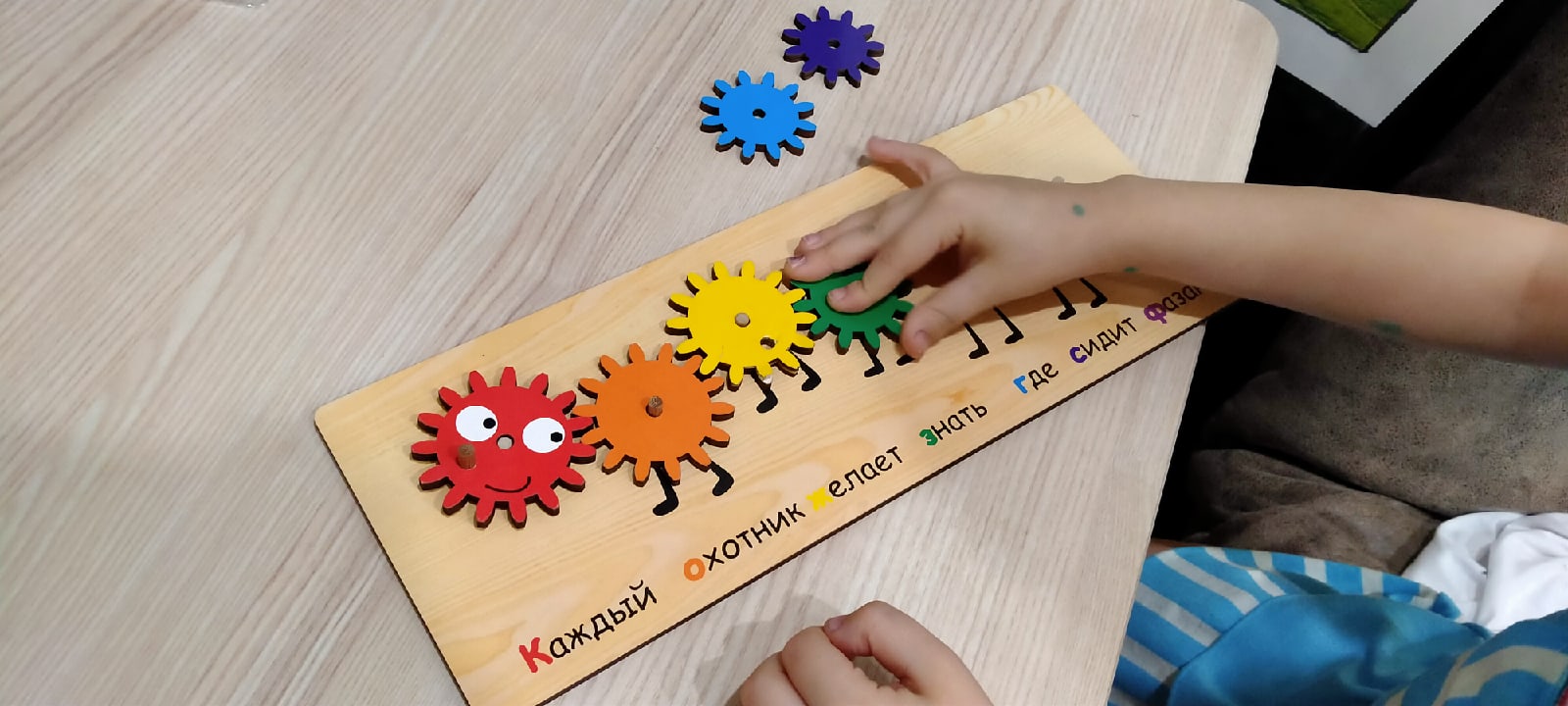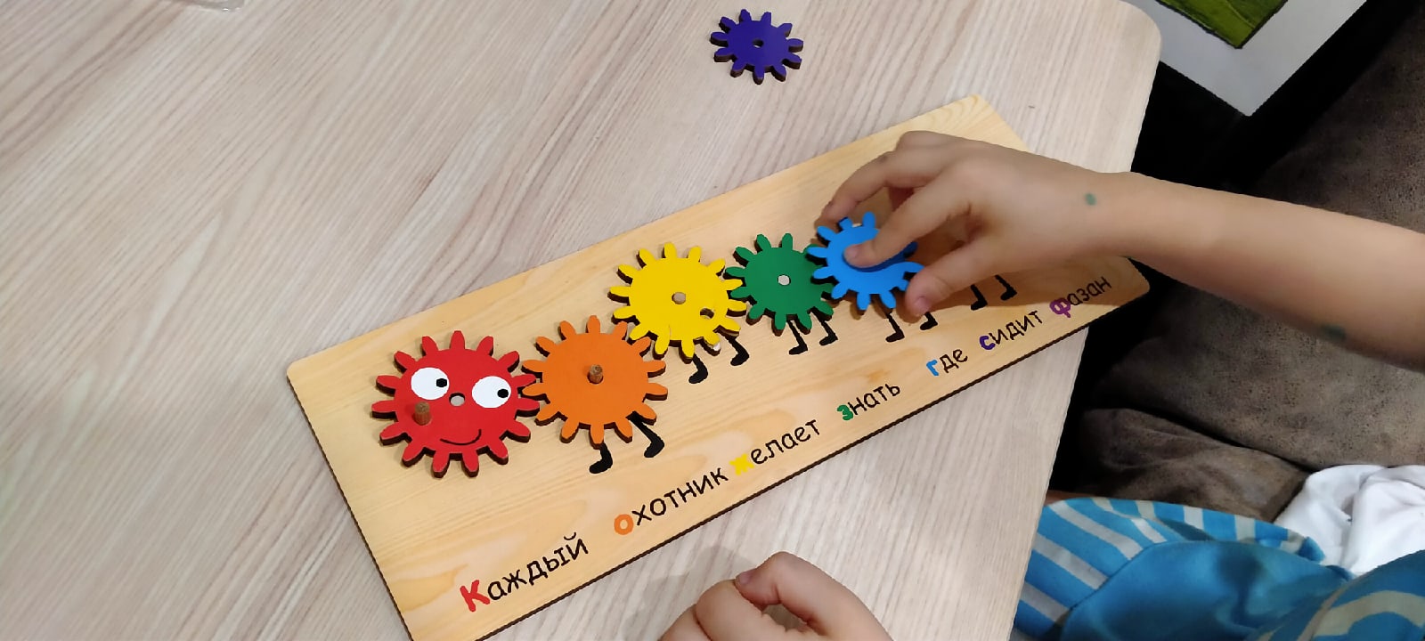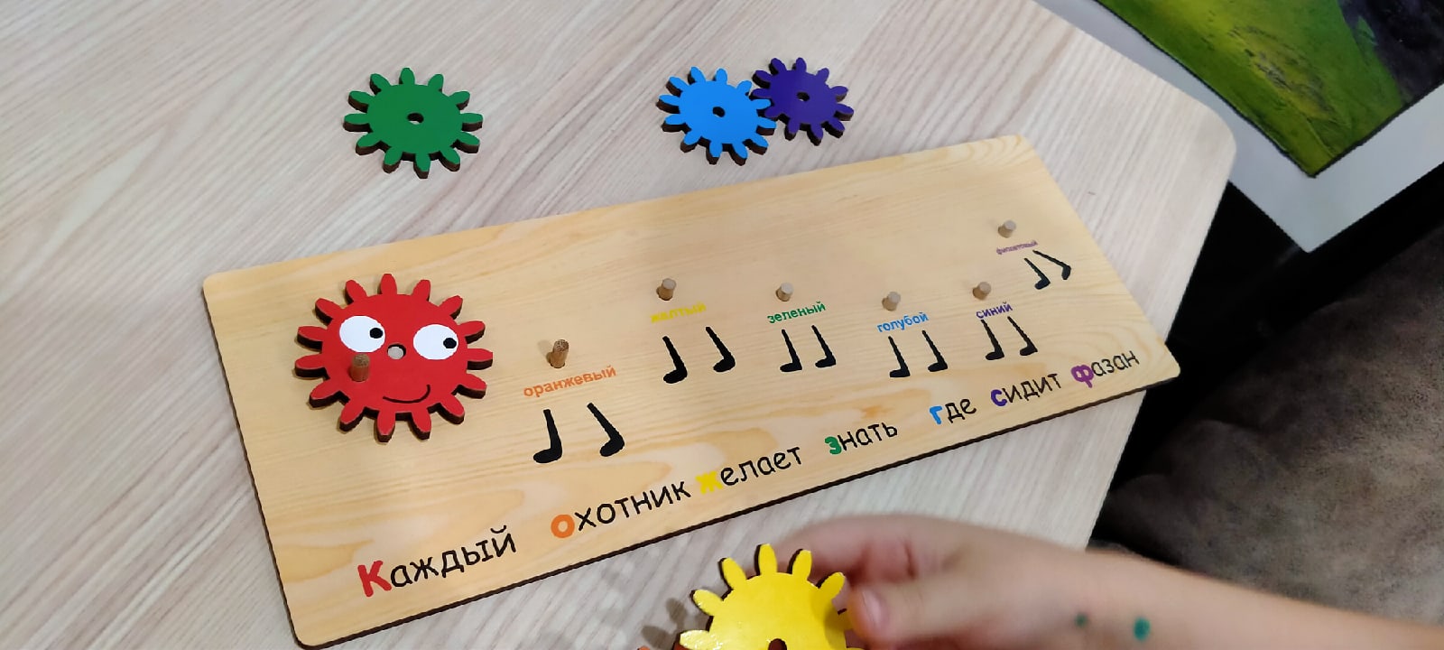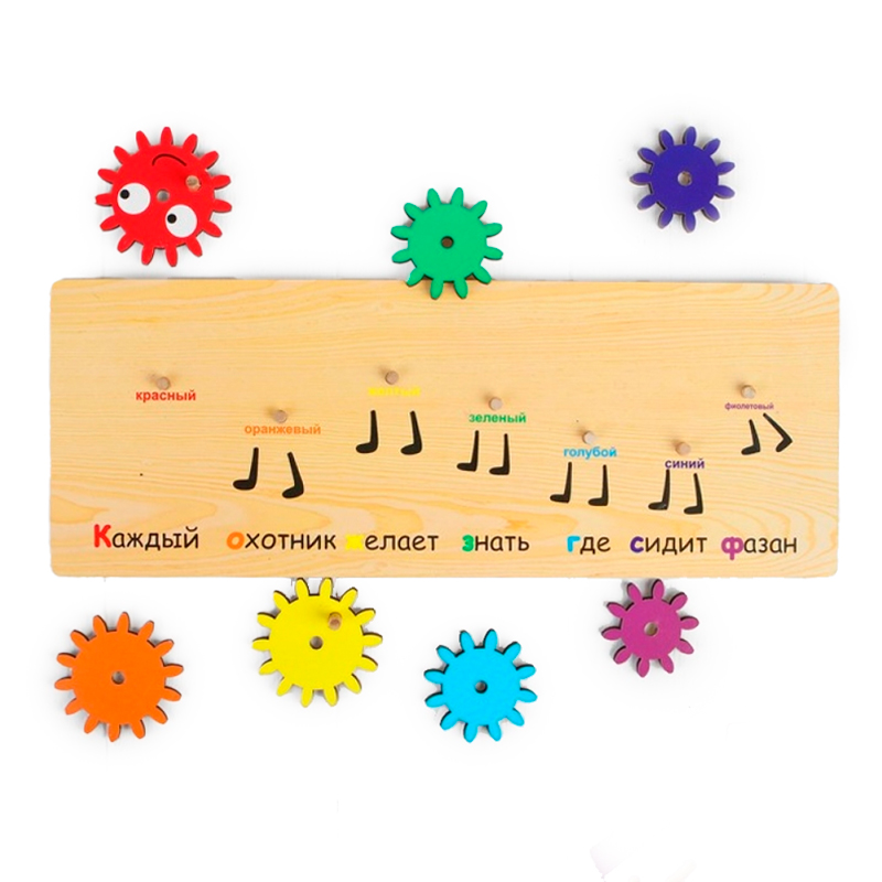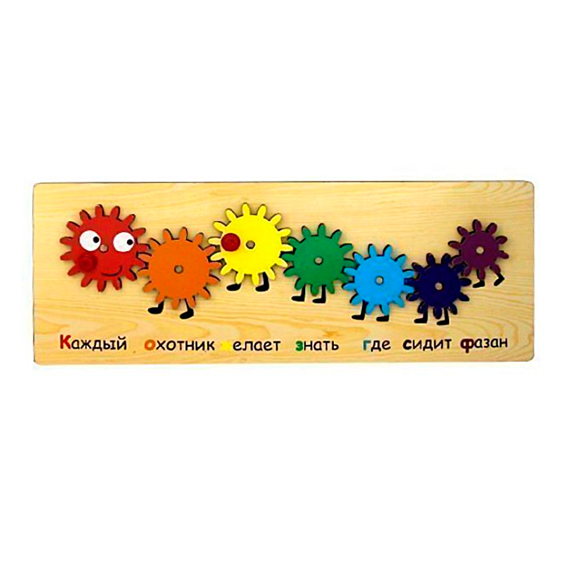 Игрушка понравилась, сын с удовольствием собирает и разбирает эту деревянную головоломку. В сборке он пользуется несколькими подсказками: 1. Под шестеренками написан, какой цвет там должен быть (причем надпись "красный" красного цвета, "оранжевый" - оранжевого и т.д.). 2. Под шестеренками написана знаменитая считалочка "Каждый охотник желает знать, где сидит фазан". И первая буква каждого предложения этой считалочки соответствует цвету необходимой шестеренки.