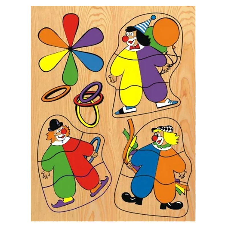 Рамка-вкладыш «Клоуны» от российского бренда «Чудо- дерево» – это простое пособие для занятий и игры с ребёнком в возрасте двух лет и старше (2+). Комплект представляет собой дощечку прямоугольной формы с нанесенным на неё рисунком цирковой тематики (воздушные шары, кольца для жонглирования), но главными героями являются три клоуна в ярких разноцветных (жёлтый, синий, красный, зелёный, оранжевый, белый, фиолетовый) костюмах и в смешных головных уборах (колпак, шляпа, кепка). Каждый из цирковых артистов состоит из трёх частей (голова, туловище, ноги). Вот из этих деревянных деталей малыш и должен собрать три единые картинки, поочередно устанавливая части в углублении игрового поля, ориентируясь на формы объектов.