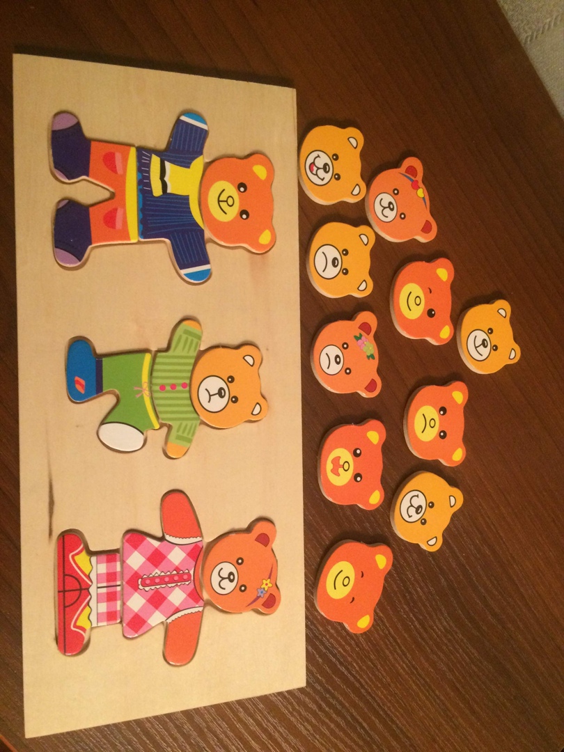 Ваш малыш быстро научится сочетать одежду, создавая новые образы. А ещё у мишек может быть разное настроение, нужно лишь поменять мордочку на весёлую, грустную или, например, сердитую. Если ребёнок уже владеет связной речью, попросите его придумать мишкам имена, собрать картинку и рассказать, куда они собрались в этой одежде и почему у них такое настроение. Детям постарше предложите обвести контур вкладышей и раскрасить по своему желанию.