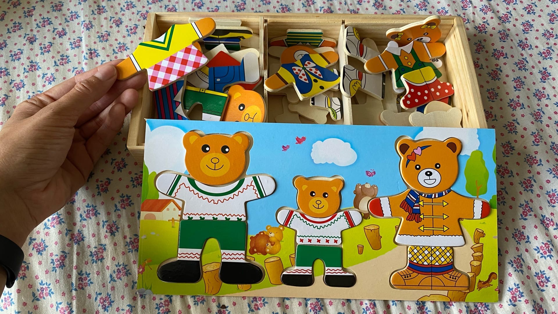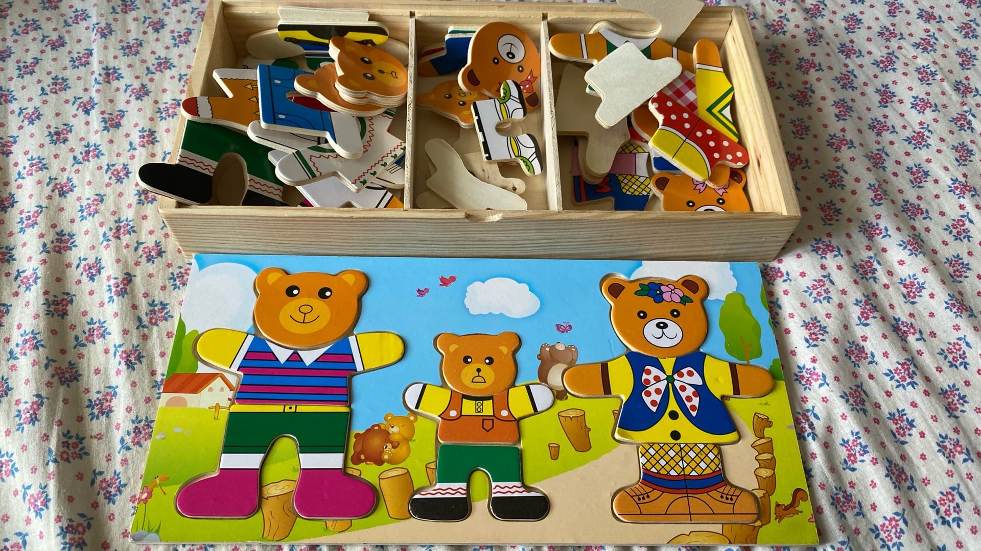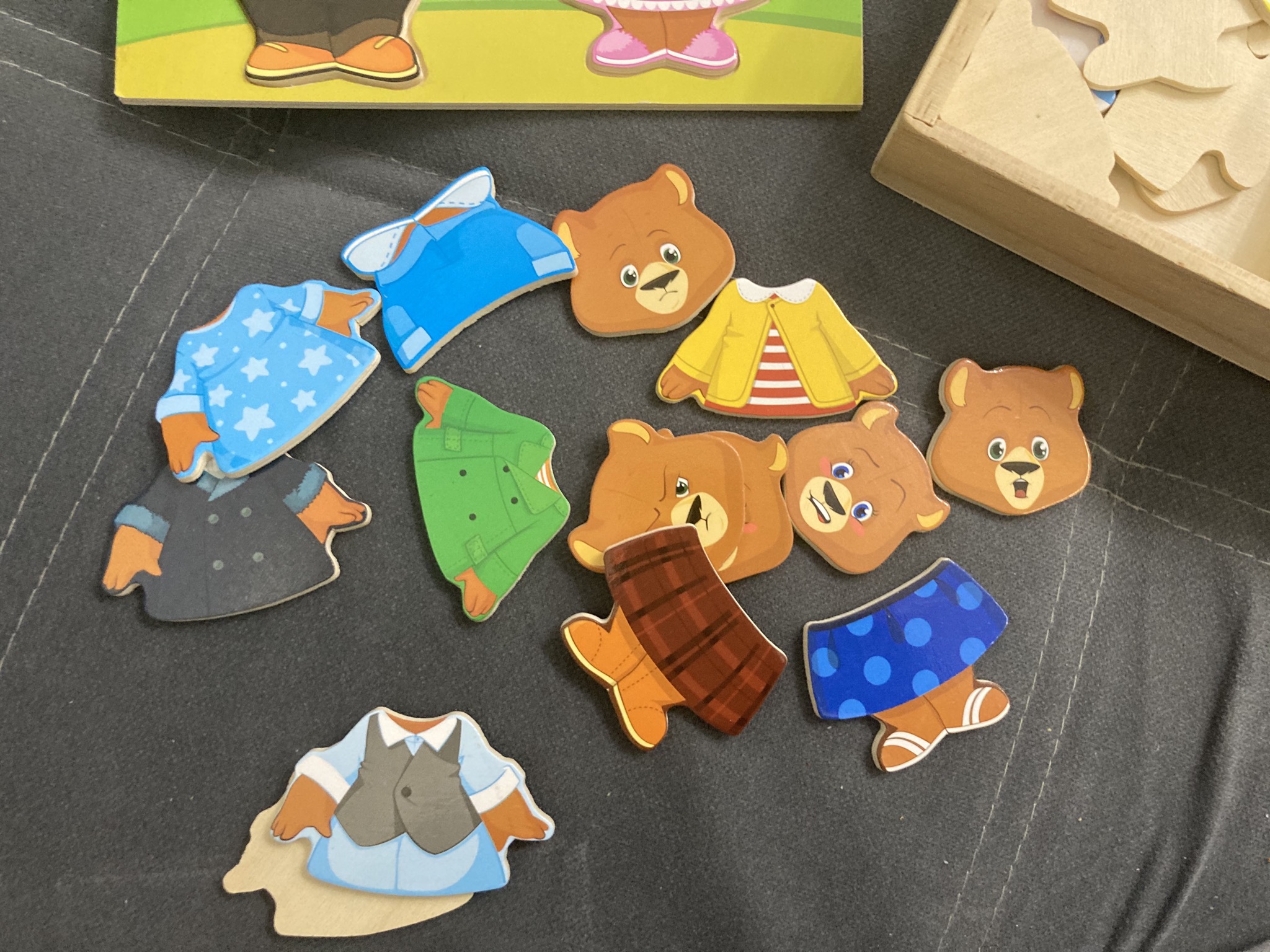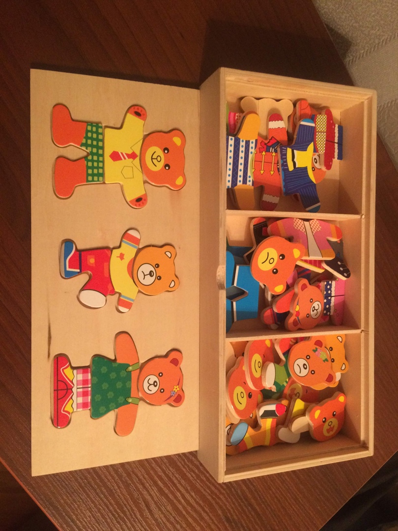 Ребенку предлагается подставить в контуры фигур медведей лица с подходящими эмоциями, одеть одежду сверху и снизу, соответствующую погоде, событию или мероприятию. А может просто ориентироваться на вкус, гармоничность и соответствующую цветовую гамму. Так же необходимо выбрать правильную обувь. Стоит отметить, что мордочки медведя и медведицы не одинаковы по размеру, поэтому ребенок должен так же сообразить кому и какую мордочку подставить. Все элементы игры качественные, хорошо обработаны от заусениц и шероховатостей, их приятно держать в руках.