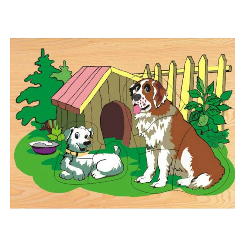 Рамка "Собака и щенок" представляет собой прямоугольную доску из фанеры, на которой изображена сюжетная картинка собаки и щенка, сидящих возле будки. Часть изображения, а именно собака и щенок, представляют собой разрезные картинки, которые и нужно собрать малышу. Перед работой взрослый должен предложить рассмотреть картинку ребёнку, поговорить о ней, выделить основные детали. Если он затрудняется с описанием картинки, взрослый помогает с помощью наводящих вопросов. Затем можно перейти к сборке. Сначала это собирание картинок прямо в рамке, а впоследствии, когда малыш освоит этот этап, можно собирать картинки прямо на столе.