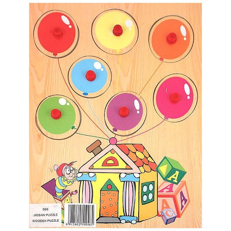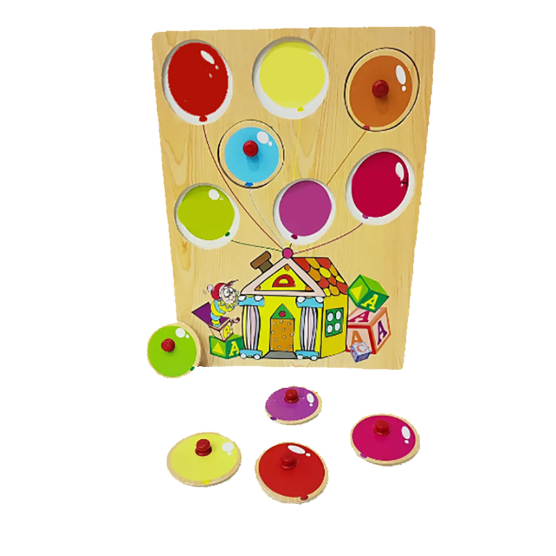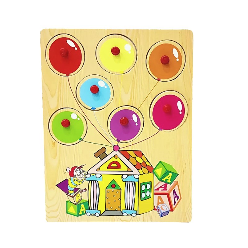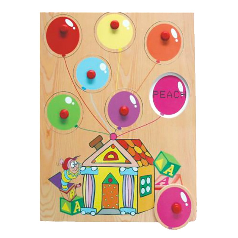 Компания "Чудо-дерево" представляет очередную разработку в серии развивающих рамок-вкладышей для малышей. Это рамка-вкладыш "Цветные воздушные шары". На сей раз она призвана познакомить детей с разными цветами и обучить названиям цветов на английском языке. На рамке изображён небольшой домик с привязанными к нему шариками разного цвета. Эти шарики и есть вкладыши – вынимающиеся элементы, под которыми изображены точно такие же шары, но с названием цвета шарика на английском языке.