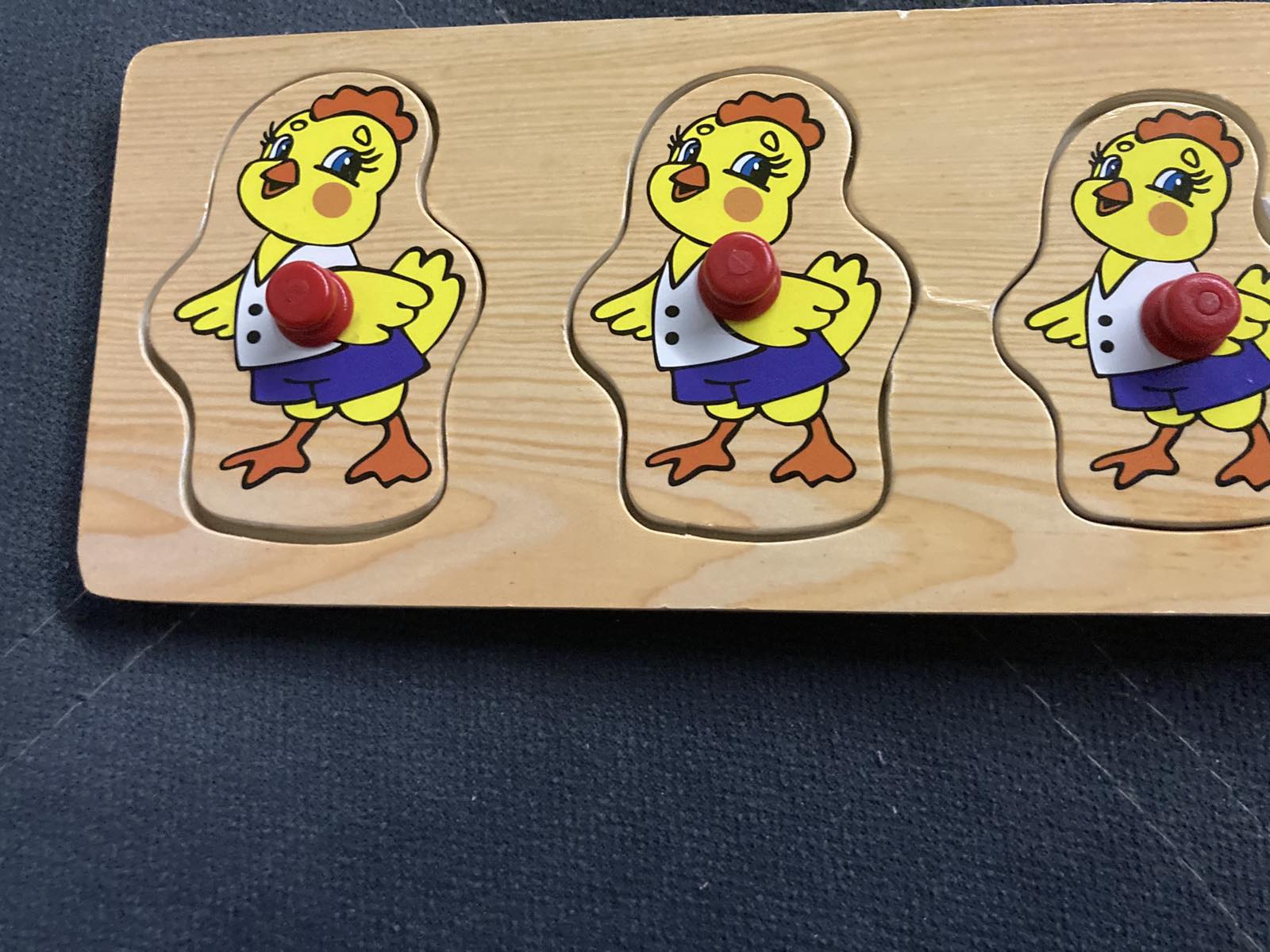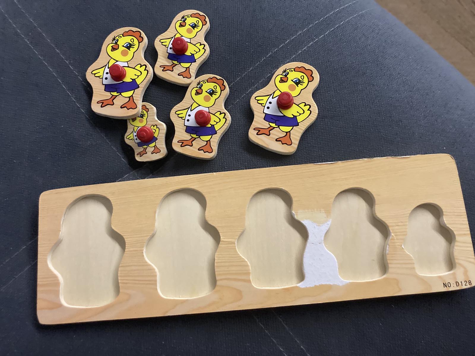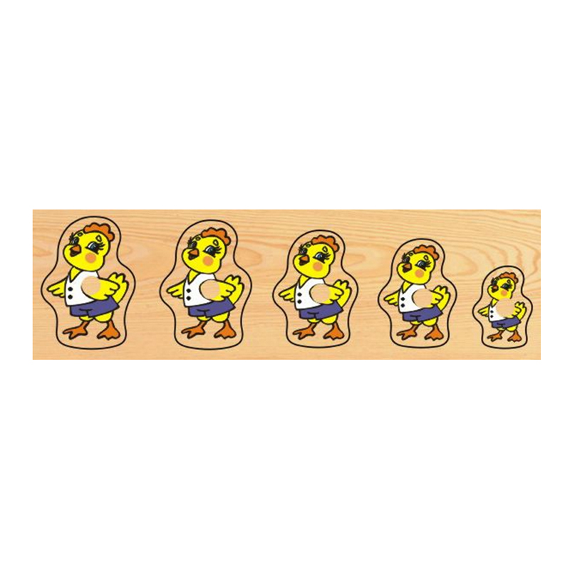 Теперь поговорим о функционале и рассмотрим варианты игры. Рамка-вкладыш "Цыплята" состоит из плоской прямоугольной основы размером 8 х 28 х 0,5 см. с пазами, а также пяти элементов с изображением милого и доброго цыпленка, причём фигурки разного размера от большего до самого меньшего, каждый из которых комбинируется только с одним из углублений. Игрушка весит 130 грамм. Упакована в термоусадочную плёнку. Товар сертифицирован и имеет соответствующий документ качества установленного образца.