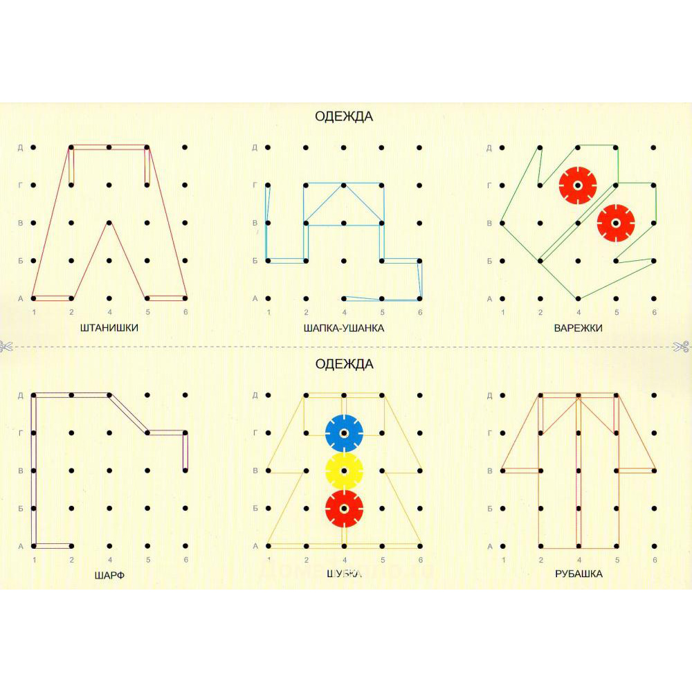 Предоставленные схемы помогают мальчикам и девочкам постичь основы плоского моделирования. С помощью резинок и фишек малыши конструируют заданный объект: кастрюлю, чашку, кровать, ёлку, платье, шарф, шапку, пылесос, стол, стул и многое другое. На внутренней стороне учебно-игрового альбома есть ряд рекомендаций и игр, которые помогут родителям и воспитателям в детских дошкольных учреждениях правильно и грамотно построить урок. На занятии в игровой форме будет донесена полезная информация и привиты новые навыки.