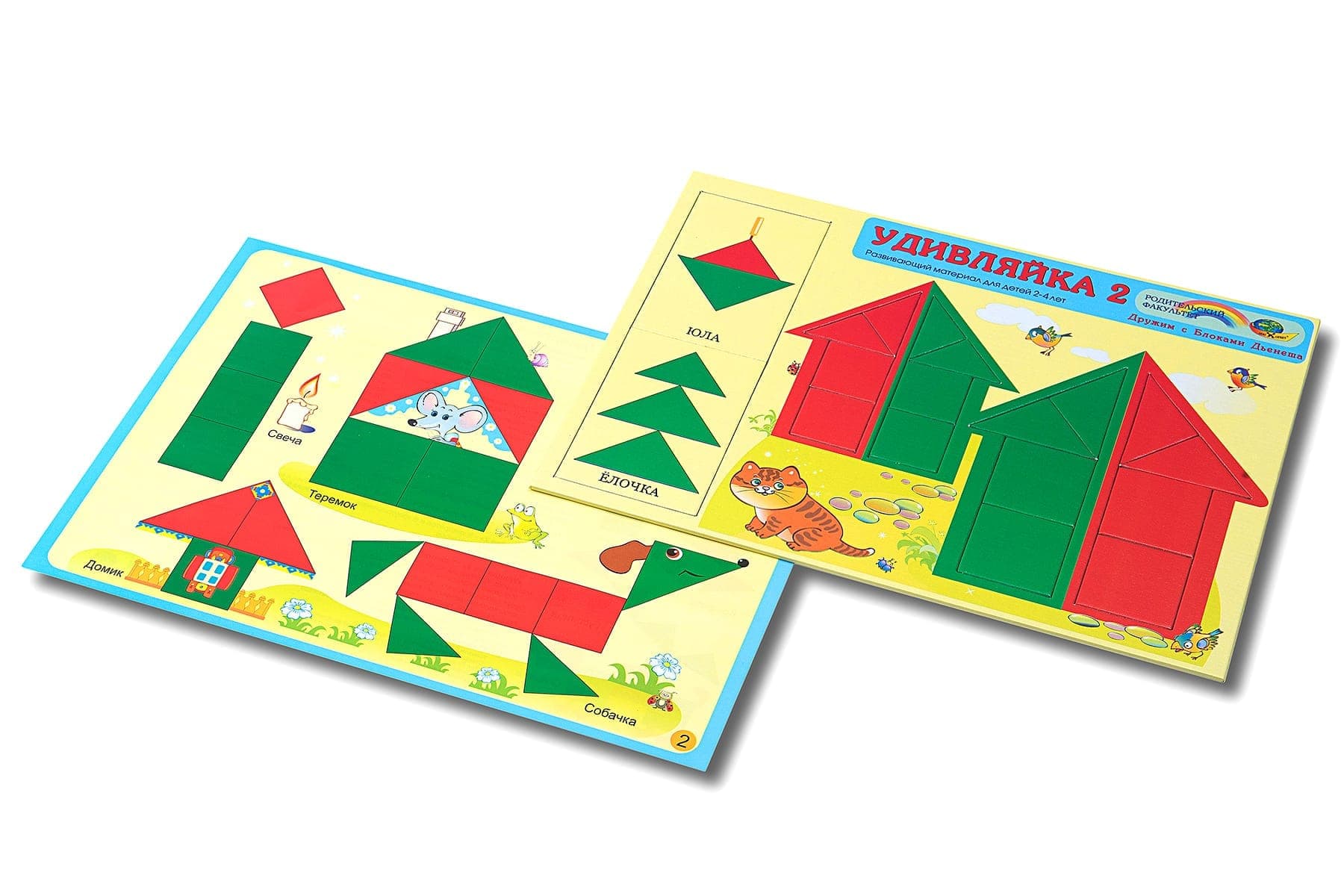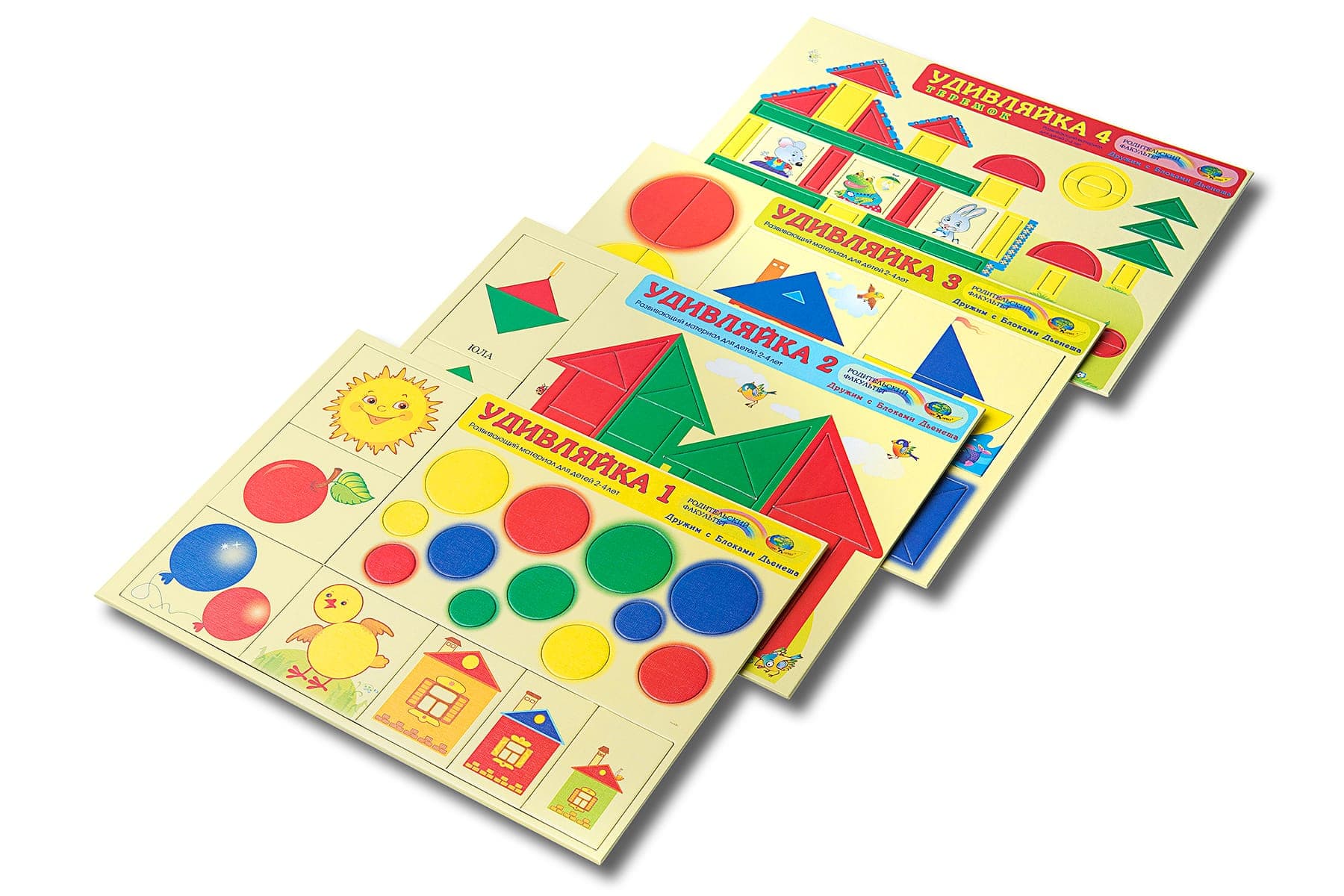 Карточки “Удивляйки №1” имеют различные задания: найти на картинке определенный предмет, соединить точки, чтобы получилась картинка, выбрать правильный ответ на вопрос и т.д. Каждое задание имеет свой уровень сложности и постепенно усложняется по мере прохождения. Серия игр «Дружим с блоками Дьенеша». Малыши смогут научиться различать круг, треугольник, квадрат; выделять свойства (цвет и размер); сравнивать и группировать. Это первые шаги в освоении логики, опыт конструирования из геометрических фигур. Игровые упражнения Удивляек – начальная ступень к играм с логическими блоками Дьенеша.