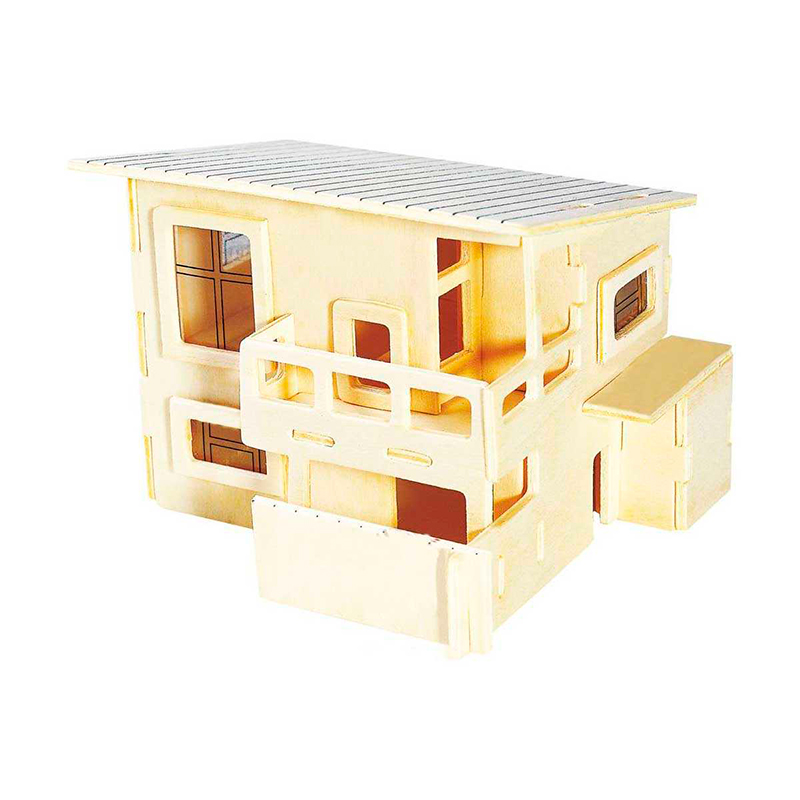 В комплекте ребята найдут несколько листов фанеры прямоугольной формы, на которых размещены детали будущей конструкции. Из 19-и частей, которые первоначально следует извлечь с помощью выдавливания их пальцами из основы, дети смогут собрать многоуровневый домик для отдыха в тёплое время суток. Двухэтажное здание с большими окнами, пологой крышей, холлом, балконом, светлыми комнатами станет дополнительным элементом в тематических и сюжетно-ролевых играх, займёт достойное место на полке в детской комнате, станет отличным подарком близким и друзьям на праздник.