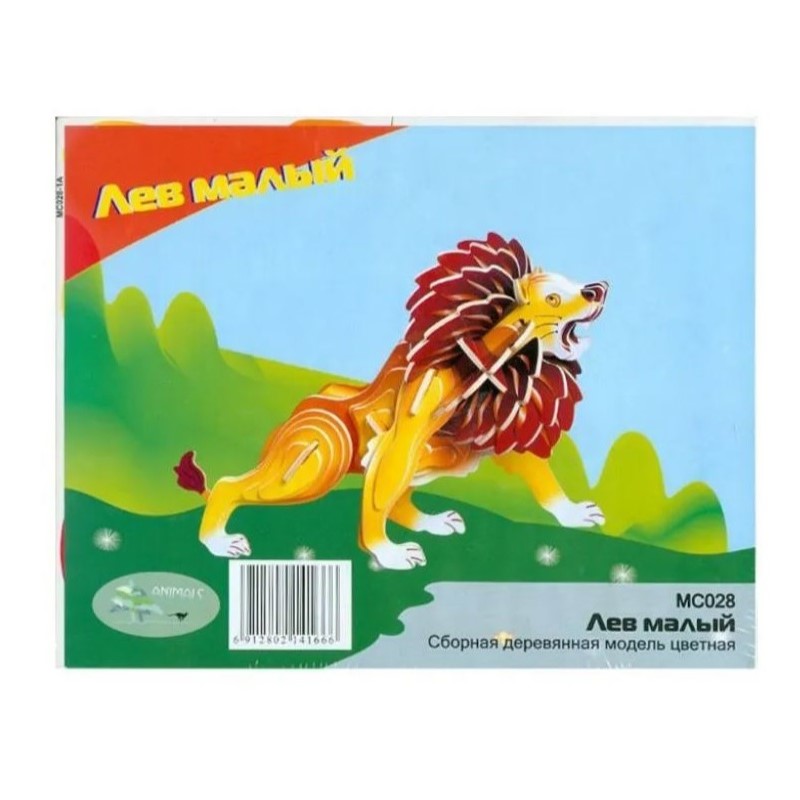 Творческий набор состоит из нескольких листов фанеры, на них вырезаны детали в определённом порядке. Во время рабочего процесса нужные элементы предстоит аккуратно вынуть из основы путём продавливания их пальцами. Для устранения заусенцев и сколов производителем предусмотрена наждачная бумага, с помощью которой вы сможете избавиться от шероховатостей. Сборка модели не вызовет у детей серьёзных трудностей. Точно следуя инструкции и внимательно изучив порядок работы, малыши без дополнительных подручных средств соберут льва, который займёт достойное место в коллекции изделий сделанных своими руками. Дети, при желании, могут раскрасить модель М028 цветами, предусмотренными природой, или придумать для льва другие краски, тем самым сделать его уникальным.