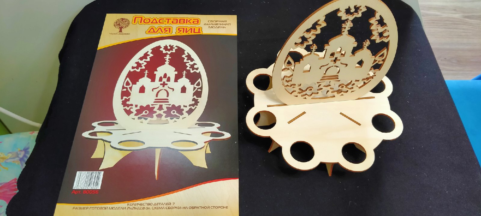 «Подставки для яиц». В процессе сборки всех элементов получается 3 небольшие деревянные подставки для яиц. Размер готовой модели 12х7,5х9,7 см.