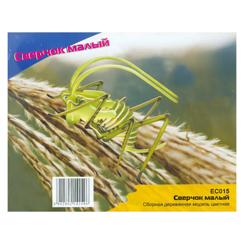 Сборная модель «Сверчок» выпускается в ассортименте, в двух вариантах: цветном и неокрашенном. В составе игры две деревянные основы, на которых размещены детали в количестве 26 штук. Перед началом творческого процесса их следует извлечь из фанеры путём надавливания на части пальцами. Упакованы составляющие в полиэтилен с цветным вкладышем, на котором дана краткая информация о насекомом – символе домашнего очага, уюта и покоя, а так же фото готовой модели. Размер упаковки 18,5 x 0,6 x 23,0 см. Вес набора 140 грамм. Товар сертифицирован и имеет соответствующий документ качества.