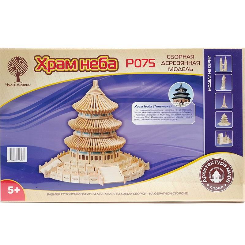 «Храм Неба» – это набор для моделирования (сборная деревянная модель) от бренда «Чудо-Дерево», предназначенный для мальчиков и девочек от пяти лет и старше (5+). В комплект входят: деревянные основы-заготовки из фанеры размером 23 х 37 х 0,3 см (5 шт.), на которых закреплены части будущей постройки (301 шт.); наждачная бумага; картинка готовой модели и подробная схема сборки храма. Все составляющие упакованы в прозрачную плёнку. Размер упаковки 370 х 15 х 230 мм. Вес игры 700 гр. Следуя пошаговой инструкции, ребята построят копию храмово-монастырского комплекса с Храмом Урожая круглой формы, построенного в Пекине в 1420 г. Прототип сборной модели занесён в Список всемирного наследия человечества ЮНЕСКО. Его территория занимает примерно 280 га. Она обнесена глухими стенами красного цвета. Чтобы готовая модель была более прочной, места стыков частей рекомендуется промазывать клеем ПВА (прозрачный, не имеет запаха). В результате получится Храм Неба размером 24,5 х 25,5 х 26,5 см.