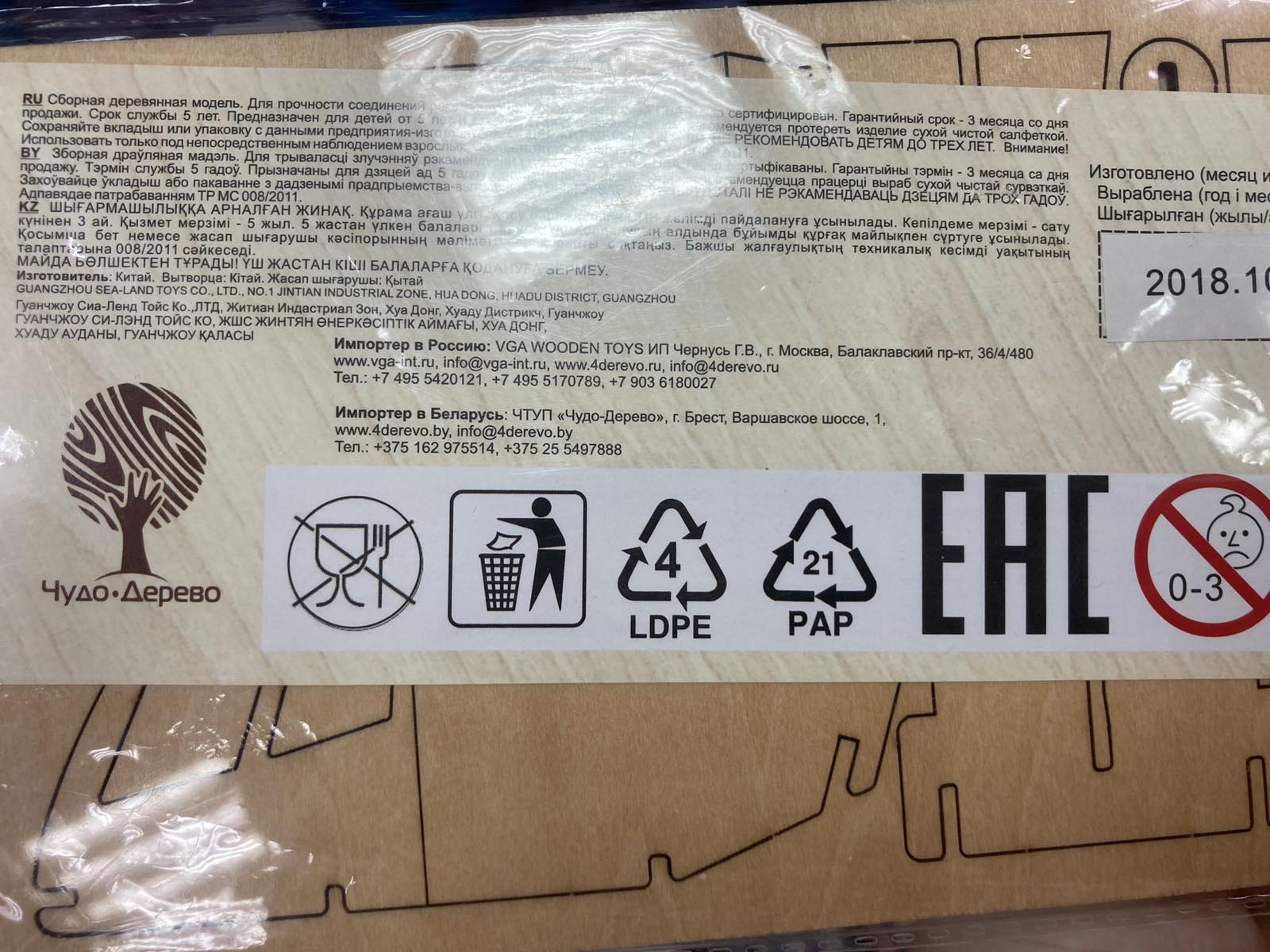Комплект включает в себя набор деталей, вырезанных на фанерных листах; схему сборки; наждачную бумагу. Детали скрепляются в порядке и очередности, обозначенной в инструкции. Для прочности соединений рекомендуется использовать клей ПВА (не токсичен, не имеет запаха, после высыхания становится прозрачным, имеет эластичный клеевой шов, при загустевании может быть разбавлен водой).