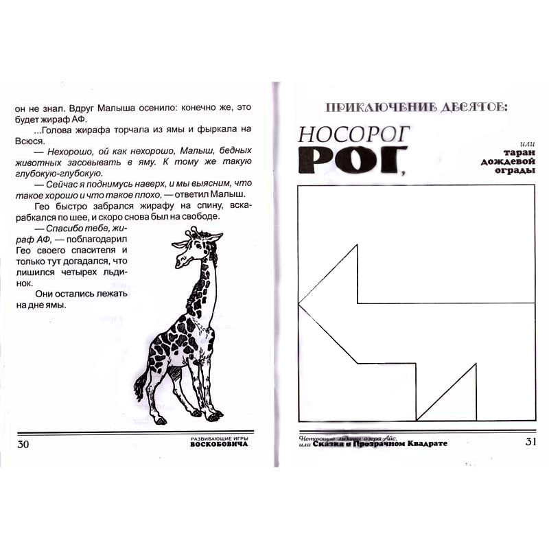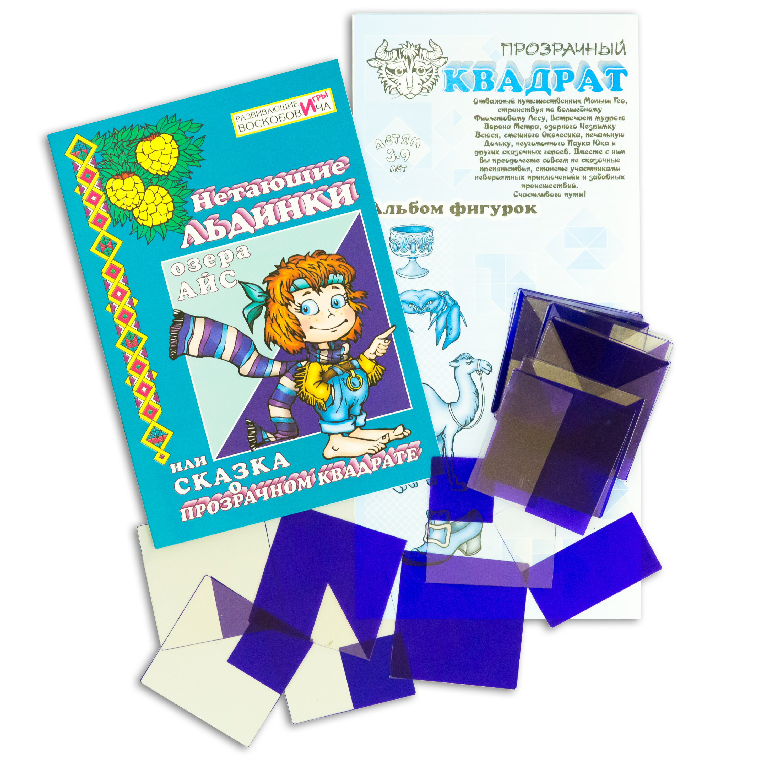 Сказка «Нетающие льдинки Озера Айс, или сказка о прозрачном квадрате», предложенная ТМ «Развивающие игры Воскобовича», обеспечивает методическое и дидактическое сопровождение игры «Прозрачный квадрат». Она издана в книге с мягкой цветной обложкой, её страницы оформлены в чёрно-белом цвете. Сюжетом для ребёнка предусмотрена организация ситуаций, способствующих развитию их зрительного восприятия, мышления, навыков моделирования, конструирования, элементарного счёта, формирования геометрических представлений, точности захвата тонких предметов и мелкой моторики в целом. Для этого понадобится игра «Прозрачный квадрат».