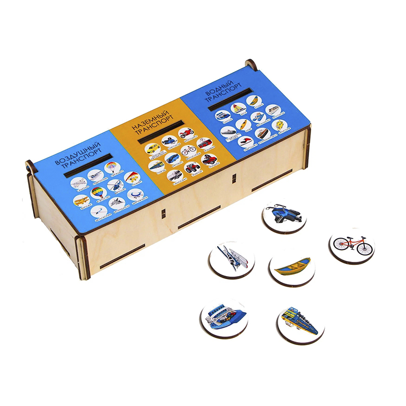 - Ящик с перегородками – 1 шт. Крышка на ящик с прорезями для опускания фишек – кругов с изображением транспорта – 1 шт.