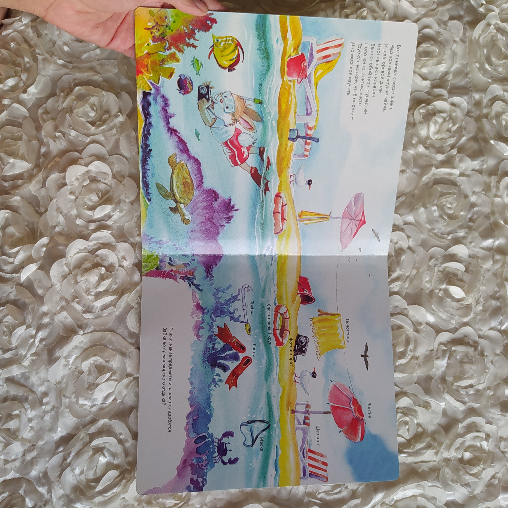 На другой страничке зайчик весной идет на пикник, ребенок узнает, что с собой надо брать.
