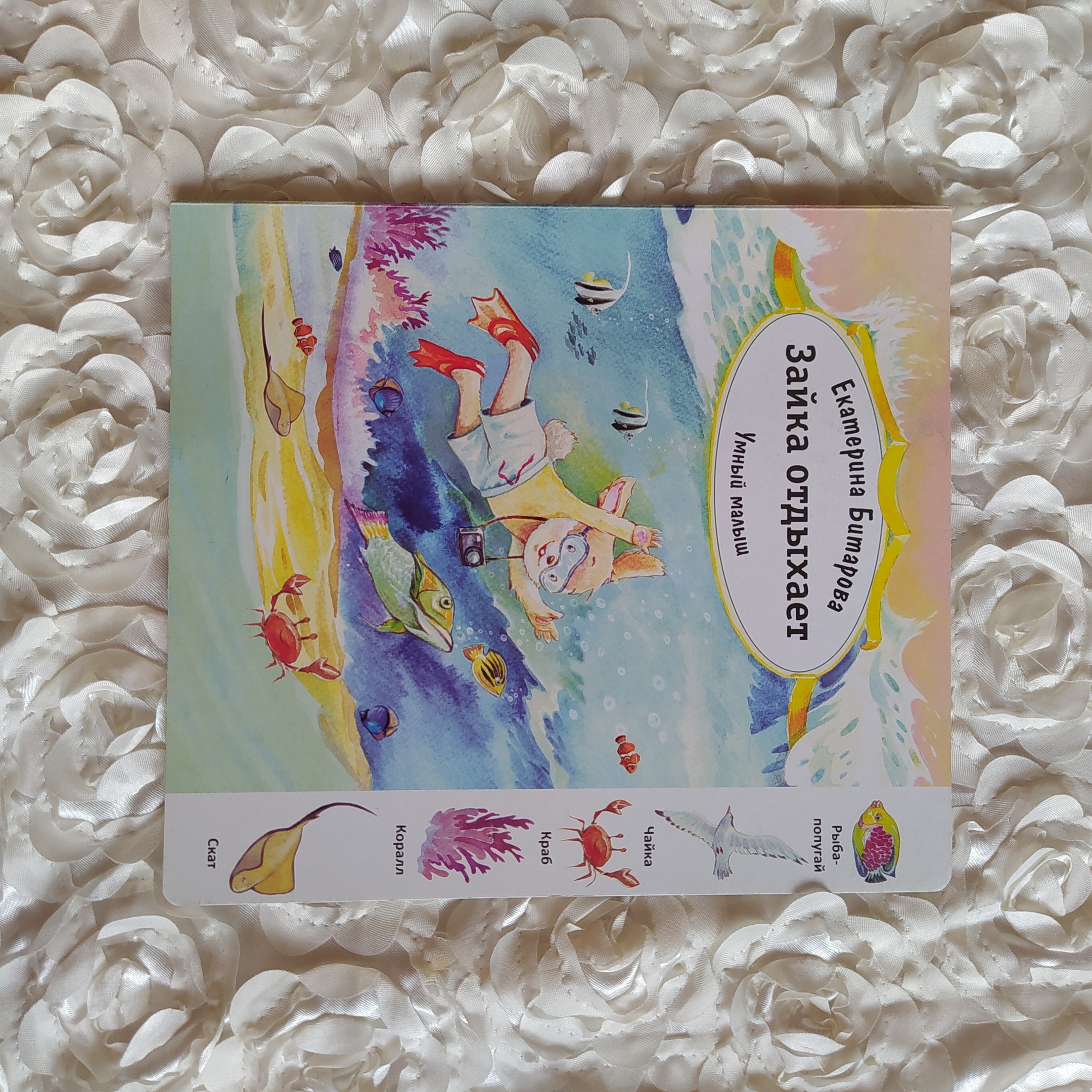 Игровая книга для самых маленьких «Зайкин день». Книга размером 24 х 21,9 см включает 10 страниц из плотного картона. На каждом развороте представлен один сюжет из жизни Зайки, рассказанный автором в стихах, а также приведён ряд вопросов по заданной теме. Например, иллюстрация первой страницы рассказывает малышам о том, какие гигиенические мероприятия проводит Зайка в утренние часы (умывается, чистит зубы, причёсывается). Тут же представлены картинки: мочалка, полотенце, расчёска, зубная паста и мыло. Ребёнку предлагается назвать все предметы, которые понадобятся Зайке в ванне. Все картинки яркие, тщательно прорисованные, тщательно детализированы, предметы узнаваемые.