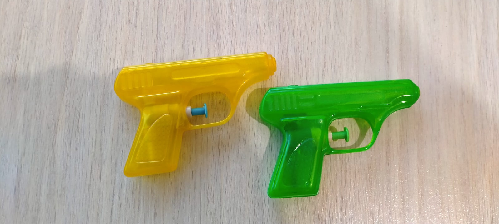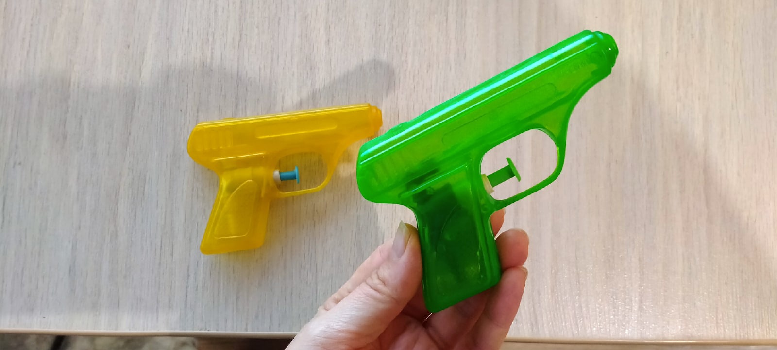Сделаны игрушки из легкого прозрачного пластика, в них виден уровень воды. Курок туговатый, но даже мой младший ребенок (ему 4 года) сам может его нажать (хоть и с усилием). Вода в пистолетах заканчивается очень быстро, надо часто перезаряжать. Поэтому такой игрушкой лучше играть рядом с водой.