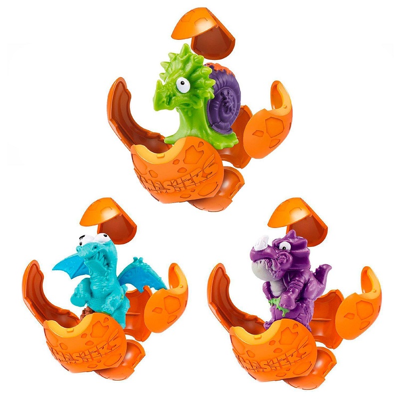 Собрать фигуру динозавра не так-то просто. Ребятам предлагается пройти увлекательный квест, для того чтобы собрать фигуру вымершей рептилии. Для начала нужно вскрыть большое яйцо, потянув за косточку или лапку. Поставляемая в комплекте скретч-карта подскажет, какие именно действия нужно совершить, чтобы раскопать ту или иную часть. На скретч-карте нанесены специальные участки с защитным слоем, стерев который юные палеонтологи смогут изучить предстоящий маршрут. Шаг за шагом, передвигаясь от одной локации к другой, ребенку необходимо открывать пакетики с сюрпризами и изучать их содержимое. Если говорить про яйца первой серии, кости будущего динозавра спрятаны в различных веществах: песок, слизь, гипсовая смесь и шипящий вулкан. Задача ребенка выполнить 5 заданий, найти все составные части и бережно, словно настоящий археолог, раскопать их. В массе кинетического песка дети найдут голову рептилии и ее хвост, в прозрачном слайме обнаружат туловище и лапки, шипящий вулкан в виде бомбочки необходимо растворить в воде, а гипсовую массу расколоть специальным молоточком, чтобы раздобыть недостающие элементы, необходимые для сборки фигурки. Освободив все составные части, можно собрать фигурку динозавра, на помощь придет иллюстрированная инструкция, в которой подробно описан каждый шаг сборки. Получившаяся фигура может поворачивать голову, двигать лапами и шевелить хвостом. В ассортименте представлено 3 модели, из составных частей можно собрать скелет тираннозавра, брахиозавра или трицератопса.