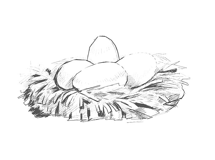 Штрихи можно применять не только как вспомогательные средства при разметке рисунка, но и как основные выразительные средства. Попробуем наметить штрихами яйцо. Проще это сделать, вписав его в прямоугольник и разметив точками симметрию. После этого достаточно соединить разметку небольшими штрихами.