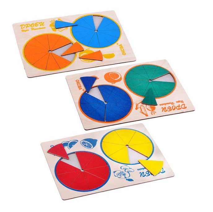 Планшет со вкладышами "Дроби. 2 уровень сложности", набор их 3-х шт, компания "Оксва"