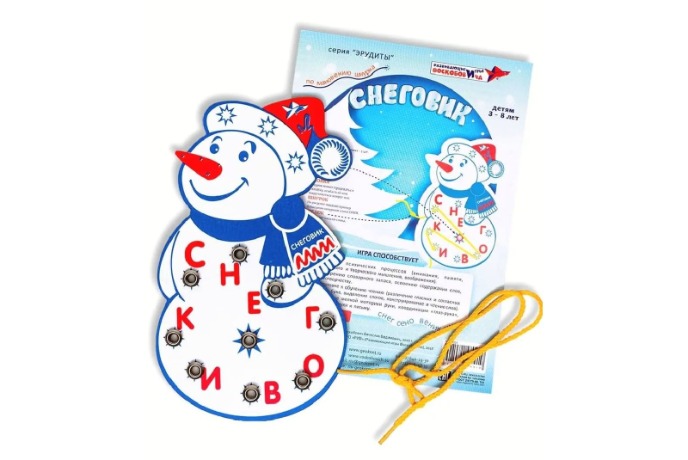 Снеговик - развивающая игра-шнуровка, разработанная по методике В. Воскобовича. Цель игры - составление слов с постепенным их усложнением, обучение чтению. Игра развивает зрительное восприятие образа буквы, мелкую моторику, точность соотносящих действий, обогащение пассивного и активного словаря, навыки звуко-буквенного анализа, навыки чтения (слоговое, понятийное). Игра рассчитана на детей от 3 до 8 лет.