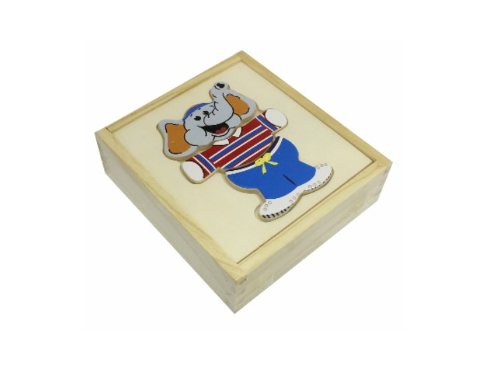 Ребенку предстоит собрать изображение слона из отдельных деревянных элементов, аккуратно размещая детали в коробке-пазле. Игра помогает познакомиться с формами и изображениями, развивает интерес к познавательной деятельности.