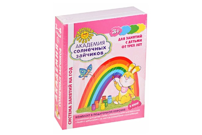 Система развивающих занятий "Академия солнечных зайчиков" для детей 3-4 лет, представляет собой комплект из 9 красочных тетрадей, которые помогают развивать ребенка по пяти направлениям: физическое, речевое, познавательное, социально-коммуникативное и художественно-эстетическое. Темы тетрадей: "Узнаем цвета", "Играем со звуками", "Учимся считать", "Развиваем речь", "Много – мало", "Развиваем руку", "Моя семья", "Познаем мир", "Хочу быть здоровым". Все книги объединены темой солнечных зайчиков, которые "подрастают" вместе с ребенком.
