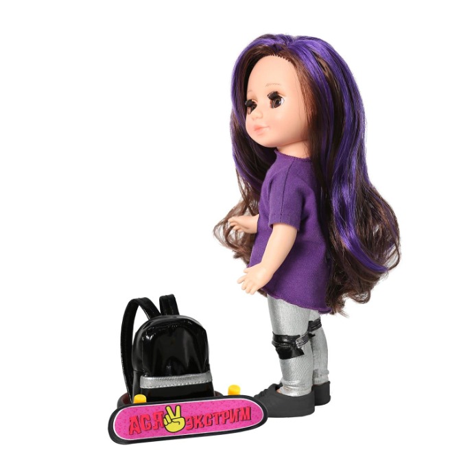 Ася полностью изготовлена из современного материала винила. У нее густые и длинные волосы, их легко расчёсывать, завивать и укладывать в причёски. У Аси вставные закрывающиеся глазки. Рост куклы 26 см. В набор входит: кукла, футболка с принтом, леггинсы, кеды, наколенники, скейтборд, наклейка на скейт, кожаный рюкзак. Одежда куклы качественно сшита, застёгивается сзади на липкую ленту. Все элементы кукольной одежды легко снять и надеть. Этот набор разнообразит сюжетно-ролевые игры с куклой.
